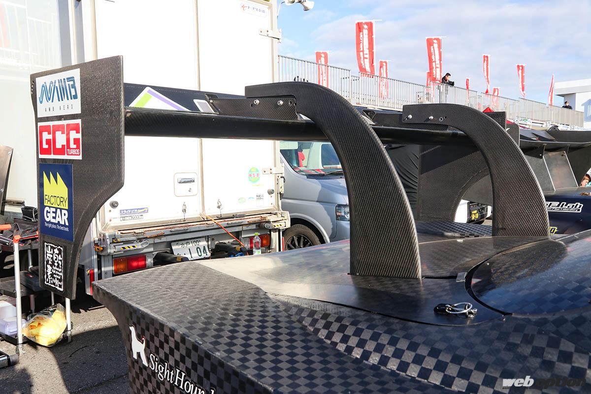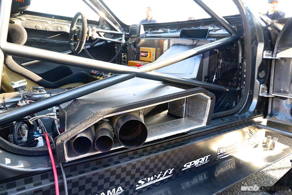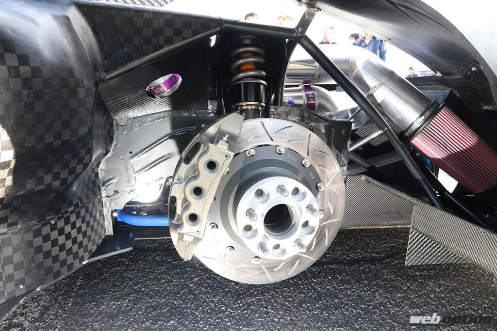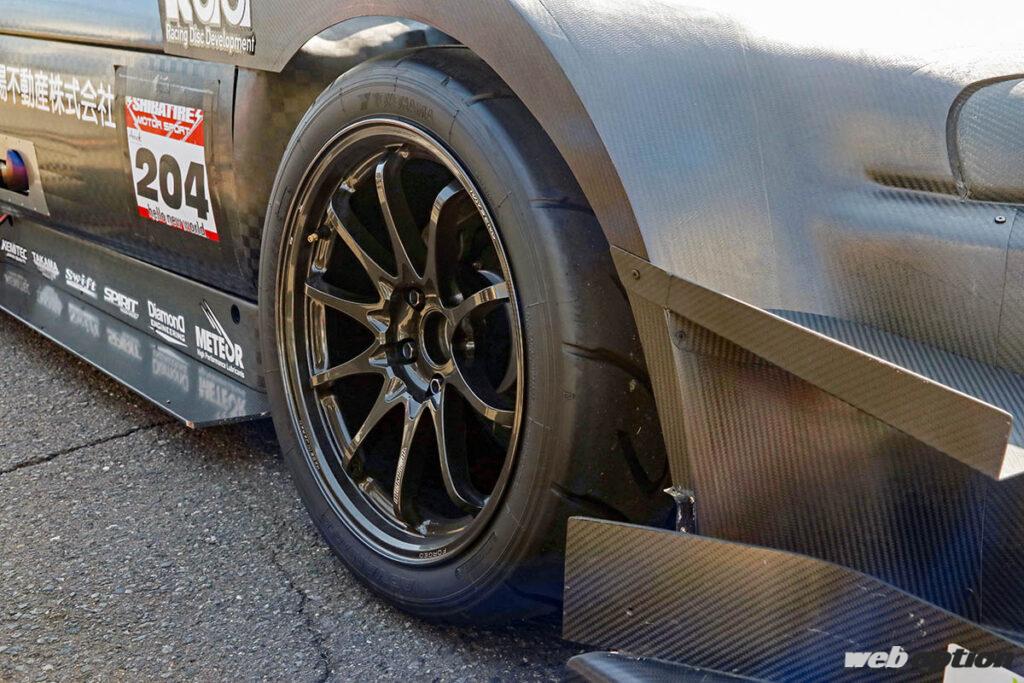 フルカーボン製のエクステリアも完全な新作。ホイールベースに変わりはないが、片側50mmのトレッド拡大に伴いさらなるワイドボディ仕様となっている。GTマシンのような目の大きな平織りカーボンの採用も坂東さんの拘りのひとつ。車重は、前のマシンよりも軽い約1100kgだ。