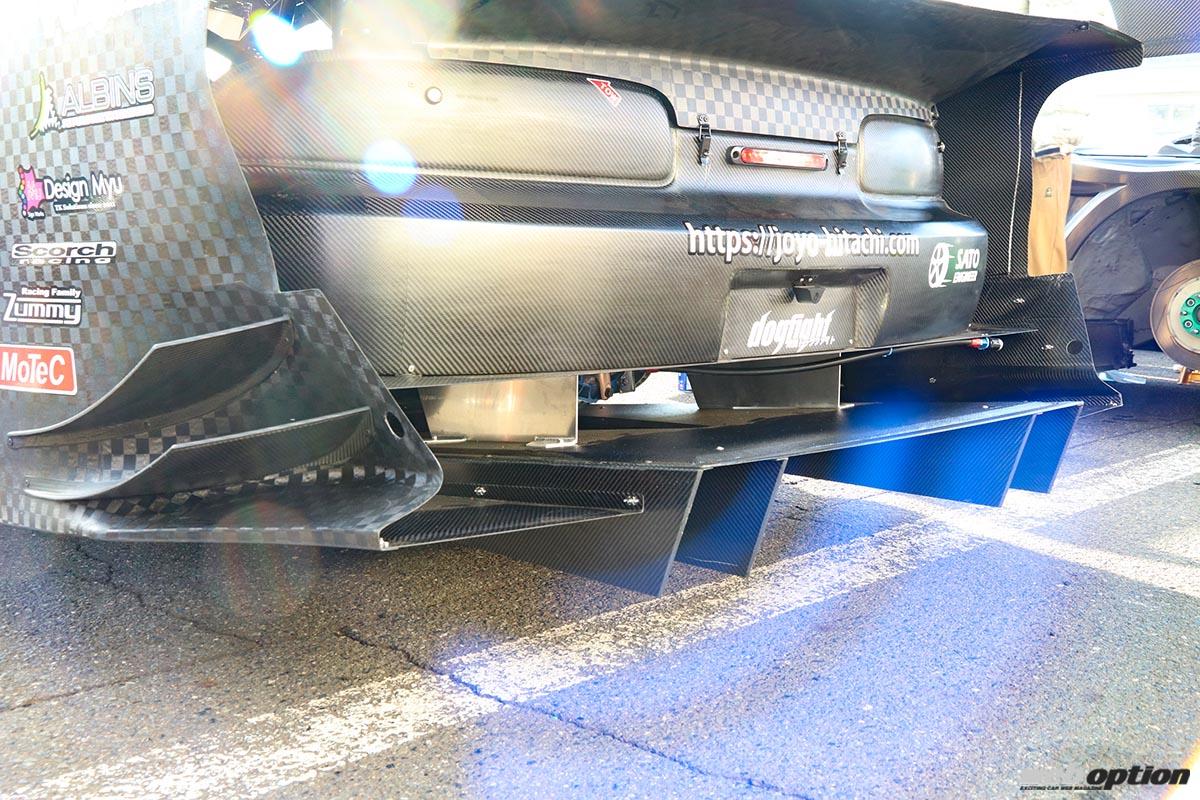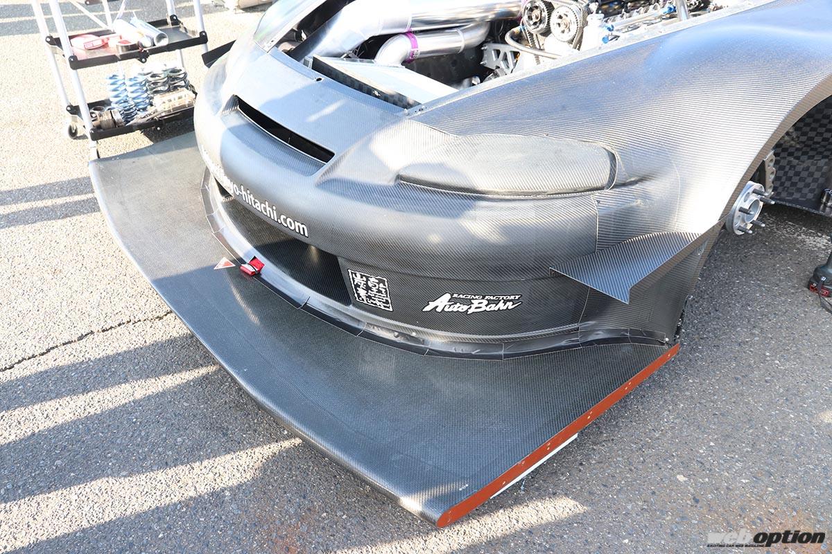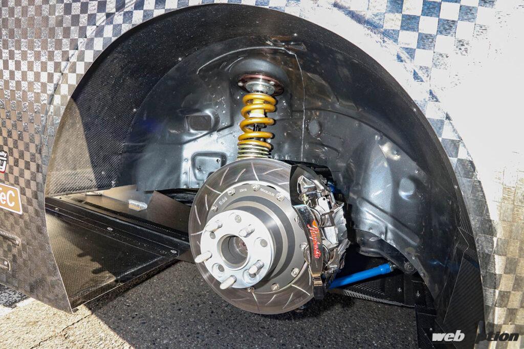 完成してから本格的な走行は3〜4回のみというシェイクダウンに近い状況ながら、Attack筑波ではあっさりと53秒786を記録。その走行で判明した課題は足回りの煮詰めだ。スピリット製のスペシャルダンパーにはフロント50kg/mm、リヤ46kg/mmのスプリングをセットしていたが、まだまだレート不足でコーナーでエアロの路面接触が発生していたという。
