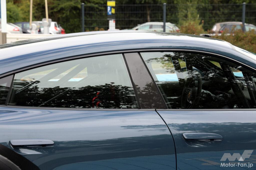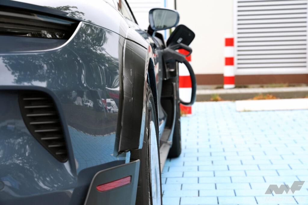 今回は充電中のため停止していたため、間近でじっくりと観察することができた。前後フェンダーフレアにテープの線が見えるほどの距離だ。その線は、標準のターボGTより1インチも幅が広いピレリのサーキット仕様タイヤを覆っている。