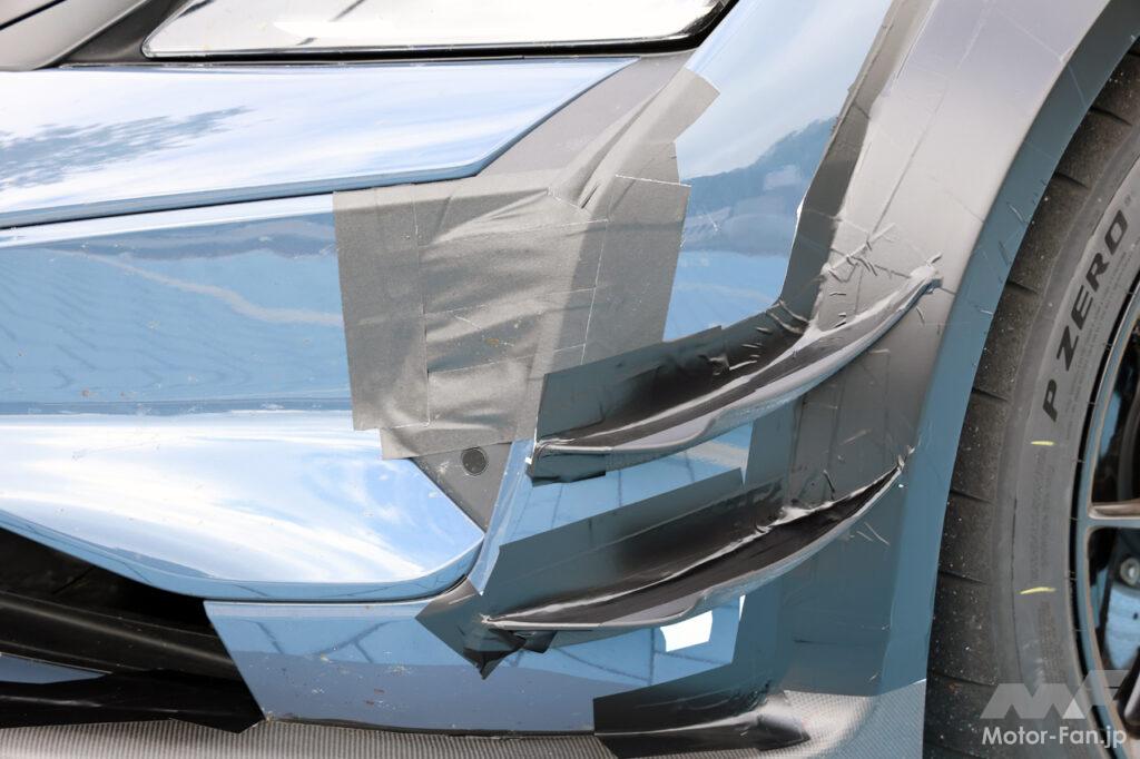 今回は充電中のため停止していたため、間近でじっくりと観察することができた。前後フェンダーフレアにテープの線が見えるほどの距離だ。その線は、標準のターボGTより1インチも幅が広いピレリのサーキット仕様タイヤを覆っている。