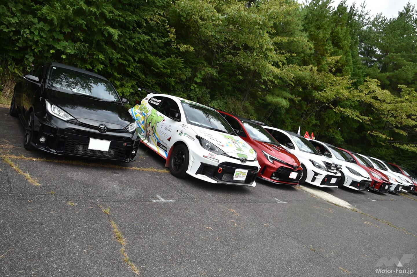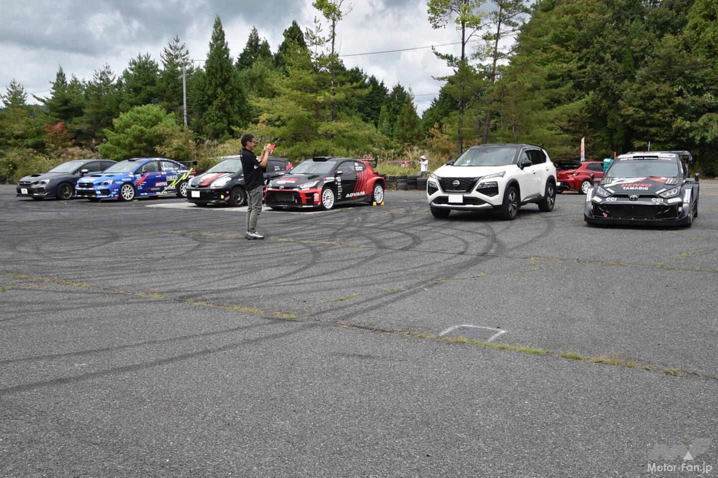 これまでスバル色が強かったツーショット撮影用のクルマだが、今回はトヨタGRヤリス・ラリー1(レプリカ)、奴田原文雄選手が全日本ラリー選手権で走られるトヨタGRヤリス・ラリー2、鎌田卓麻選手が全日本ラリー選手権を走らせ、同乗試乗会にも使用されたシュコダ・ファビア(R5)、TOYOTA GAZOO RacingのGRヤリスが並べられた。