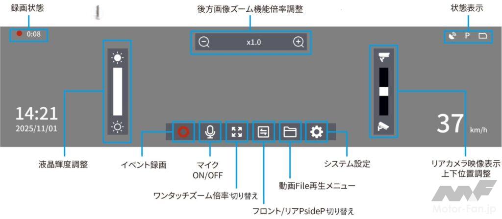 11型IPS液晶ディスプレイや引き出し式フロントカメラを搭載したミラー型の本体にコンパクトな防水・防塵リヤカメラをパッケージした2ピース仕様。多くの車両に加工を施さず簡単に取り付けられ、本体はケーブル接続部が車内側から見えない独自の形状としている。