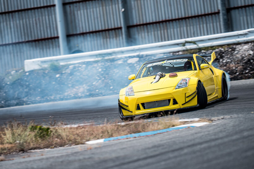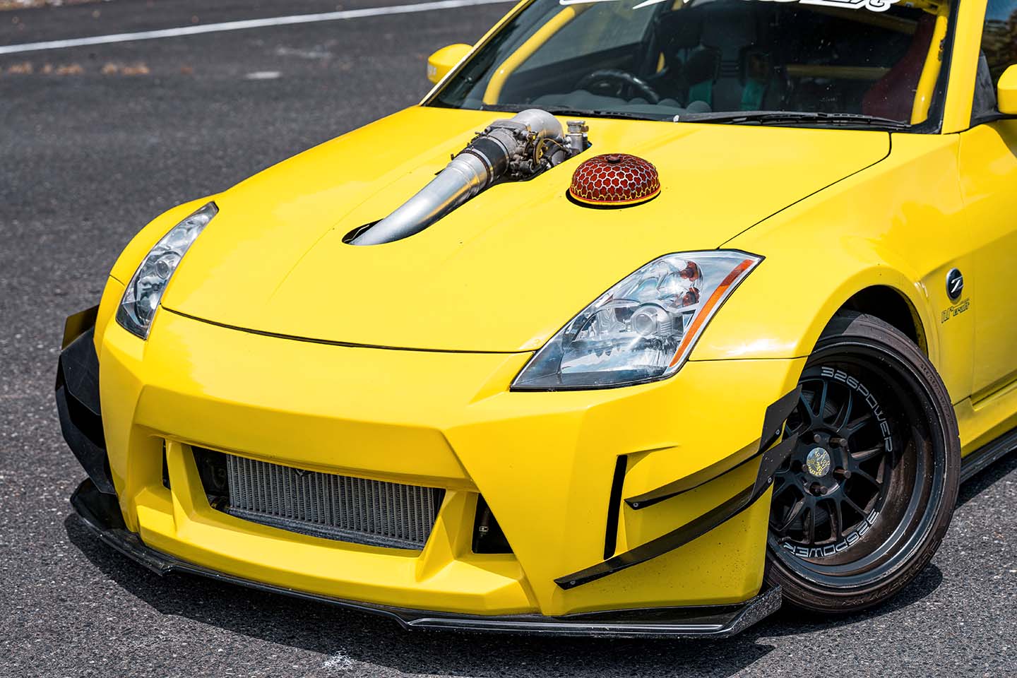 ビビッドなサンシャインイエローのワイドボディに、ボンネットから大胆に飛び出したパイピングとエアクリーナー。その姿から放たれる迫力のドリフトで観る者の度肝を抜くZ33。ステアリングを握るのは、ガレージUG代表の吉岡さんだ。