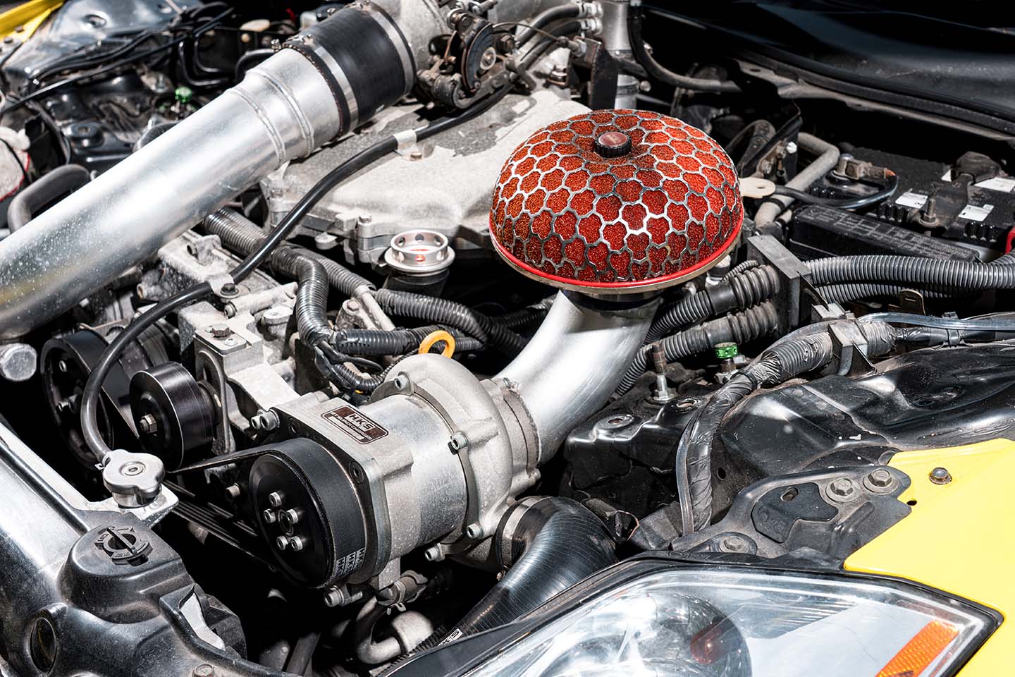 スロットル横に鎮座するエアクリーナーも同じノリだ。もちろん、スロットル横に鎮座したエアクリーナーも同様のノリだ。スワップしたスーパーチャージャー仕様のチューンドVQ35DEをサポートショップのNRクラフトでセッティングしたところ、その数値は吉岡さんの期待値を大きく下回る300ps台後半だった。