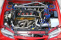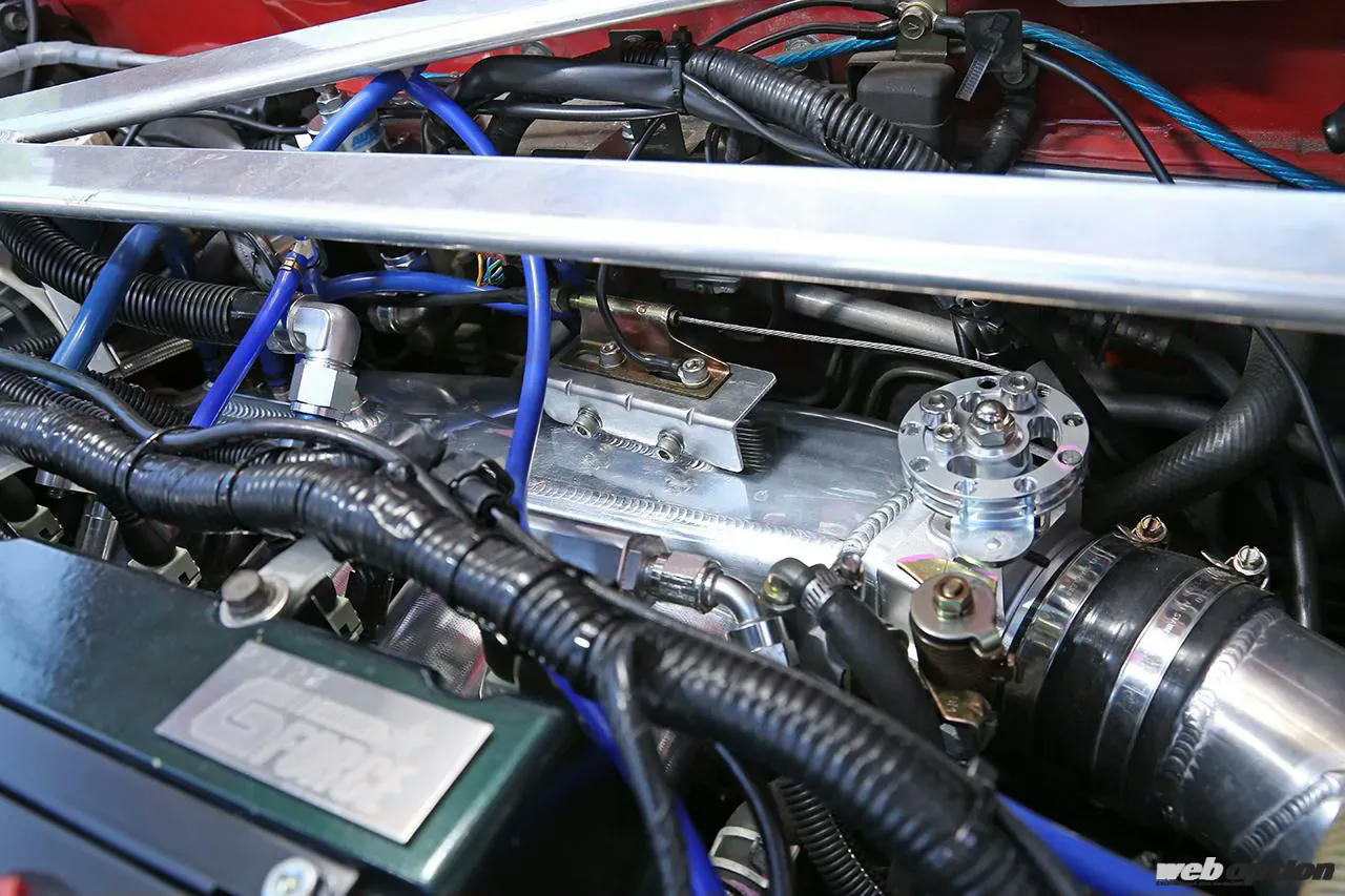エンジンは、腰下に東名パワードの94mmストローカーキットを組んだ2.2L仕様。ヘッドはインテーク側にHKSの可変バルタイシステムVカムプロ、EX側カムに東名パワードの270度をセットし、ポートの段付き修正と合わせて吸排気効率を極限まで高めている。