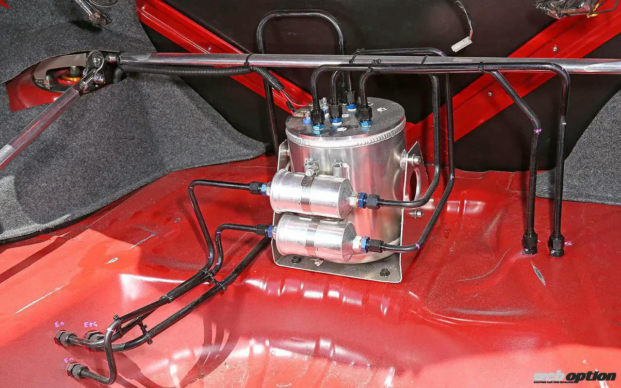 燃料系は900ccインジェクターに255L/hポンプを2機がけで強化。トランク内にはメカニカルなレイアウトでコレクタータンクを配置している。