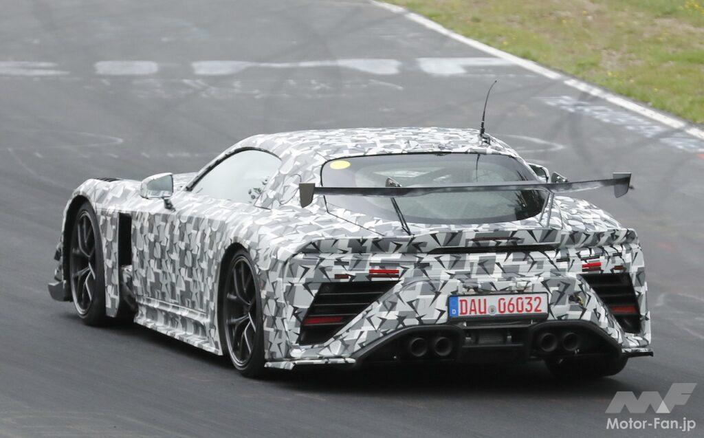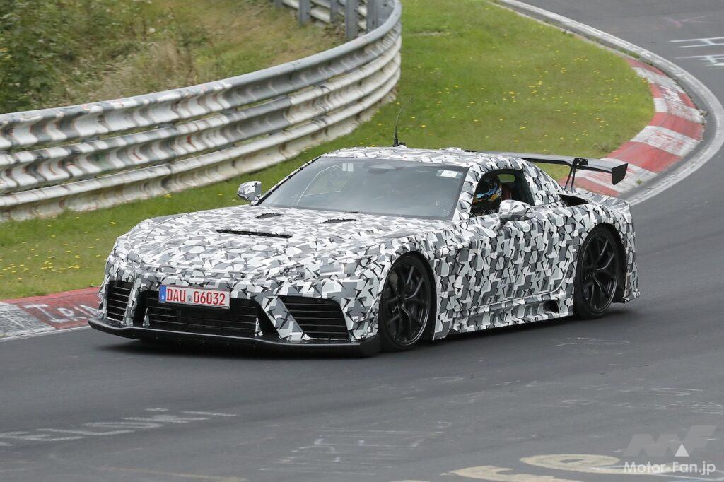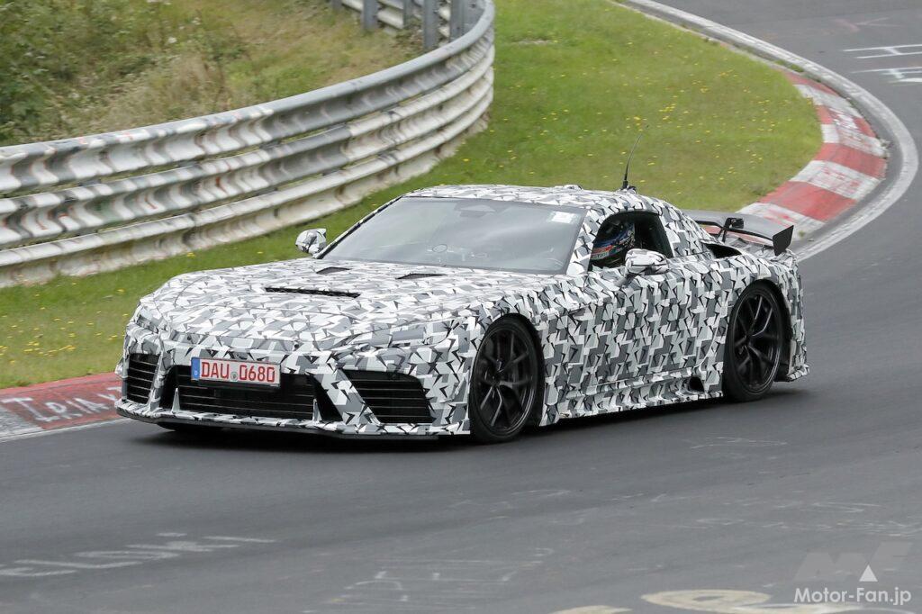 レクサスが現在、開発中の「LFA」後継モデル(通称LAR)。ニュルブルクリンクで捉えた3台のプロトタイプは、大型のリアウイングと大きなチンスポイラーを備えたモデル、小型のウイングを備えたモデル、そしてまったくウイングのないプロトタイプモデルだ。
