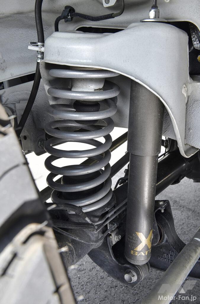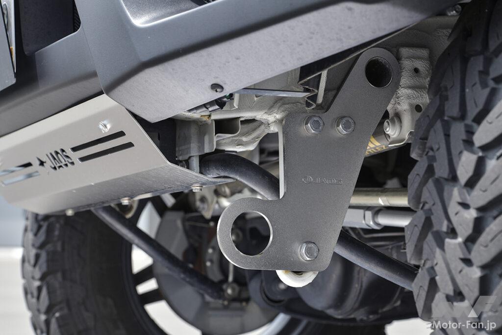 他にもボトムを切り上げたスタイリッシュなスポーツカウルから機能的でオフロードスタイルの演出に欠かせないマッドガードⅢ、貼るだけでドアハンドルやフューエルリッドなどにキズが入るのを防ぐ各種プロテクターまで大小様々なアイテムがスタンバイ。リフトアップ関連においても予算やアップ量、セッティング幅など好みに合わせて選べるようにラインアップを充実させている。デモカーに装着しているのは、40㎜アップを実現するバトルズのVFSバージョンAコンプリート。キャスター角を補正するアシストキット、車軸のズレを補正するラテラルロッドもセットになったコンプリートの名に相応しいパッケージとなる。