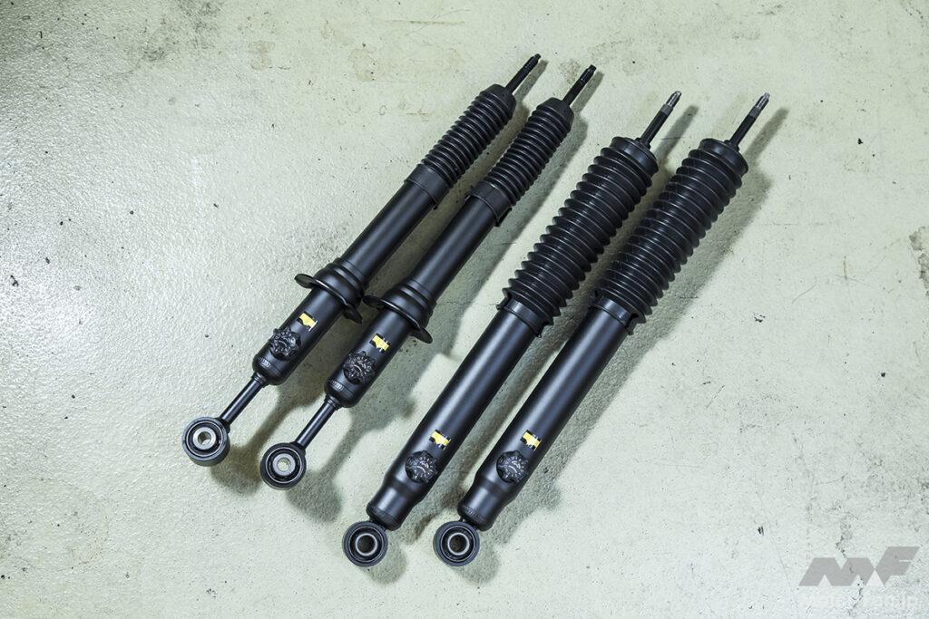 もちろん、搭載エンジンや積載量、普段使うシチュエーションによってベストアンサーは変わるはずだ。常に重い荷物を積んで多人数乗車する機会が多ければ、スプリングレートを相応に高めるべきだし、一人乗り+空荷であれば純正相当のレートでもいい。常に荷室に重い荷物を積みっぱなしであれば、リアだけ固めのスプリングを選んでもいいだろう。たとえ純正ホイール&タイヤであっても、このリフトアップキットだけを取り入れてもいい。その上で、個体に応じてキメ細かく減衰力を設定する楽しみもある。