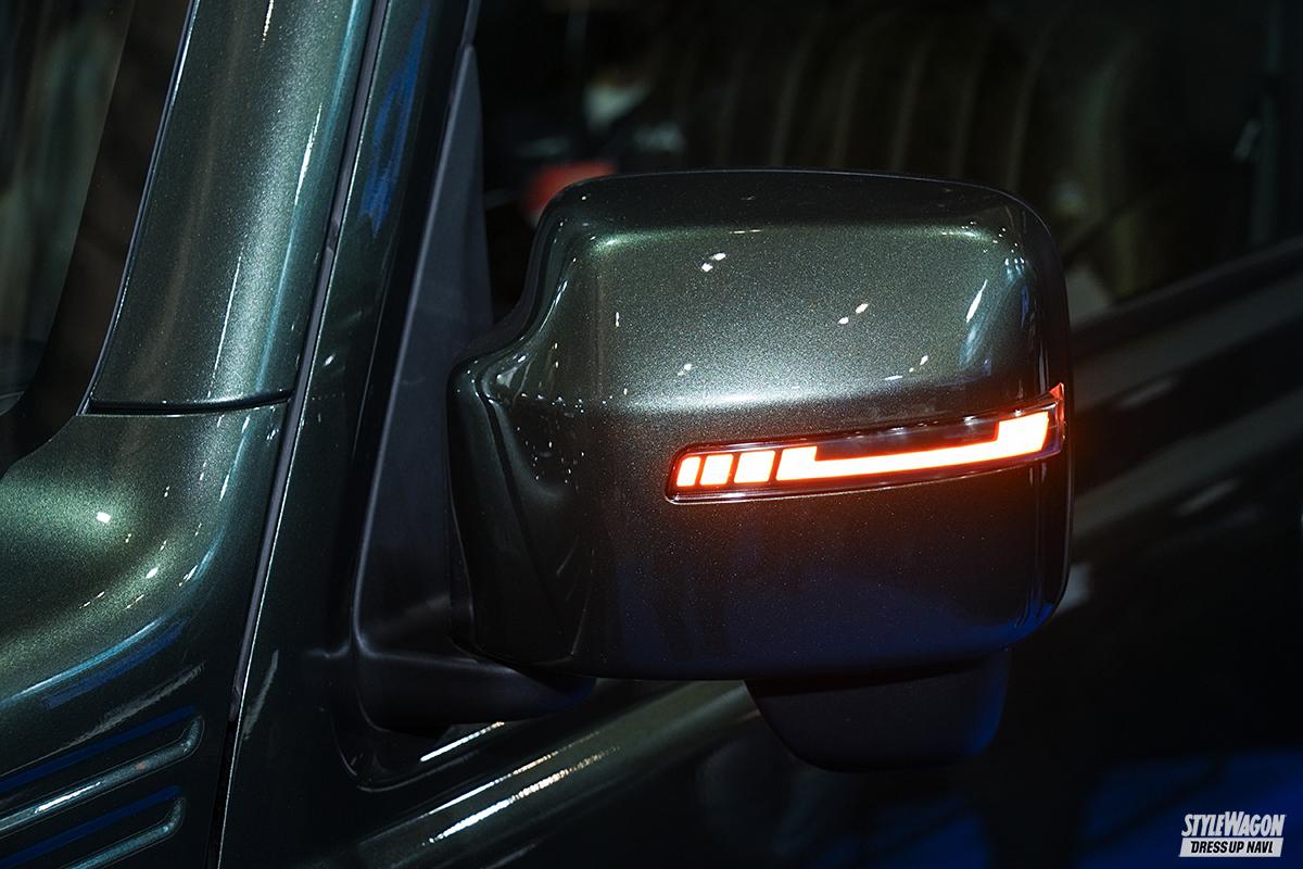 ショウワガレージブースに展示されたジムニー&シエラには開発されたばかりの新作アイテムが色々と装着されていた。注目はLEDシーケンシャルドアミラーウインカータイプ2。カラー豊富で同時装着可能はドアミラーカバーも登場。
