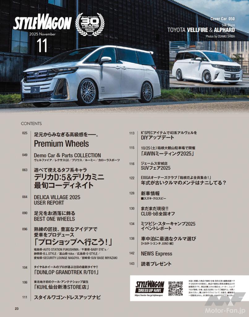スタイルワゴン11月号では、最近のクルマの「格」があがっていることもあり、やはりホイールもプレミアム感の高いものを選びたいと、そんなサンプルをクローズアップ。ステイタス爆上がり、ギャラリーの目線も釘付けとなる至高のスタイルを手に入れよう。そして、オフ系ミニバンとして多くのファンを魅了しているデリカD:5&デリカミニの車種別特集も展開。魅力的なパーツ多数で、自分に合ったカスタマイズが見つかるはずだ。さらに、そんなカスタマイズを支えてくれるプロショップも紹介中。ラッピングやセキュリティといった注目のトピックスを専門にするショップなど、みんなのカスタムの味方になってくれる。もちろん全国のオフ会レポートなども掲載中なので、みんながどんなことをしているか? 最旬のトレンドはどんなものか? などをバッチリチェックしていこう。