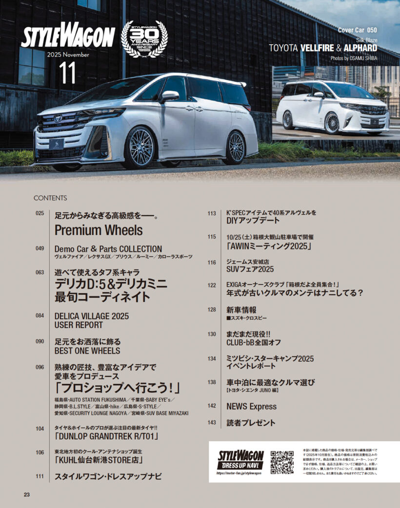 カスタム いま履きたいプレミアム系ホイールを一挙紹介!! 最新カスタマイズのすべてがわかる『スタイルワゴン11月号』は10月16日発売!【写真・4枚目】 アルヴェルはもちろん、高級志向が進むSUVにも、いまやプレミアムホイールは欠かせない。もちろん高価格だけど、それ相応のステイタス感を実現できる。 ボディキットからインテリアパーツまで、全方位でカスタムをプロデュースできる「シルクブレイズ」。その最新デモカーとなる40ヴェルファイア&アルファードが今月号の表紙になっている。 熱烈なファンが多く、アウトドア&オフ系スタイルのワゴンシーンを牽引しているデリカD:5&デリカミニ。カスタムパーツの選択肢も多く、自分のコンセプトに合ったスタイルをコディネイトできる。 愛車のカスタマイズをサポートしてくれるのはもちろんのこと、豊富なノウハウや技術で、最適解を導き出してくれるプロショップ。それぞれ得意分野などもあるので要チェックだ。 SUBARU車の中でも唯一無二の3列シートを誇る「エクシーガ」。すでに年式の古い車両も多いが、オフ会参加車にどんなメンテナンスをしているのかを聞いてみたぞ。 今月の車中泊企画は、大人気ミニバン「シエンタ」が登場。モデリスタと共同開発として話題の「JUNO」で快適に過ごすことはできるのか? リアル調査してみたぞ。 毎年恒例のミツビシ・スターキャンプのイベントレポートも掲載。キャンプはもちろん、家族みんなで楽しめるコンテンツも盛り沢山。 スタイルワゴン2025年11月号 この画像の記事を読む