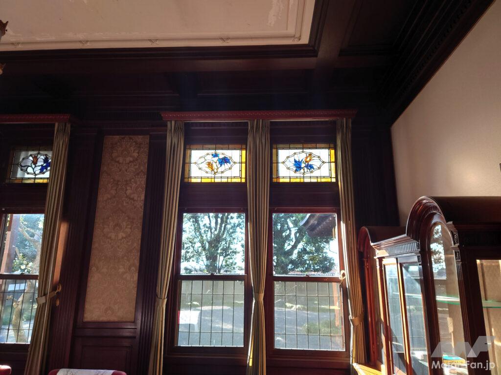 ちなみにステンドグラスは、よく見ると1枚ずつ微妙にデザインが異なっています。カーテンがグリーンの部屋は、ガラスをオレンジ色に。ガラスがグリーンの部屋はカーテンがオレンジ色になっているなど、同じモノでも良さそうなところも嗜好を変えるこだわりが凄すぎます。