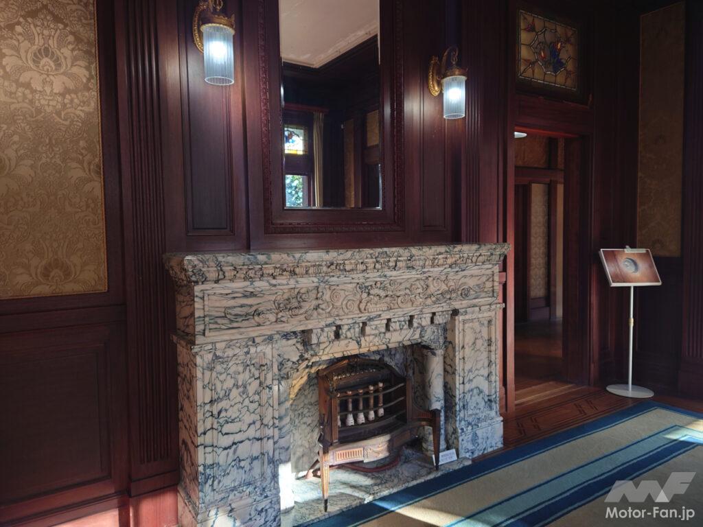 大理石の暖炉は電気ヒーターで、中に水を入れて蒸気を出して加湿する機能も備えています。中島知久平さんは明治17年生まれながら、現代人と変わらない感覚だったことが想像できますね。もちろんシャンデリアも電気で灯されます。柱にはコンセントがあるし、ブレーカーも装備。