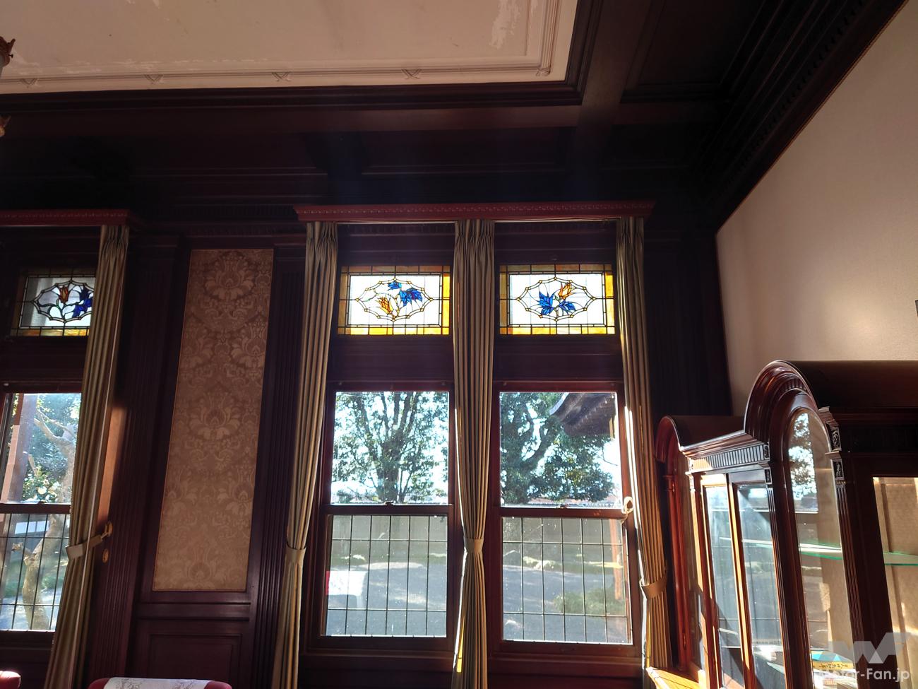 ちなみにステンドグラスは、よく見ると1枚ずつ微妙にデザインが異なっています。カーテンがグリーンの部屋は、ガラスをオレンジ色に。ガラスがグリーンの部屋はカーテンがオレンジ色になっているなど、同じモノでも良さそうなところも嗜好を変えるこだわりが凄すぎます。