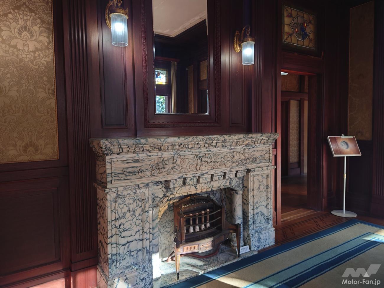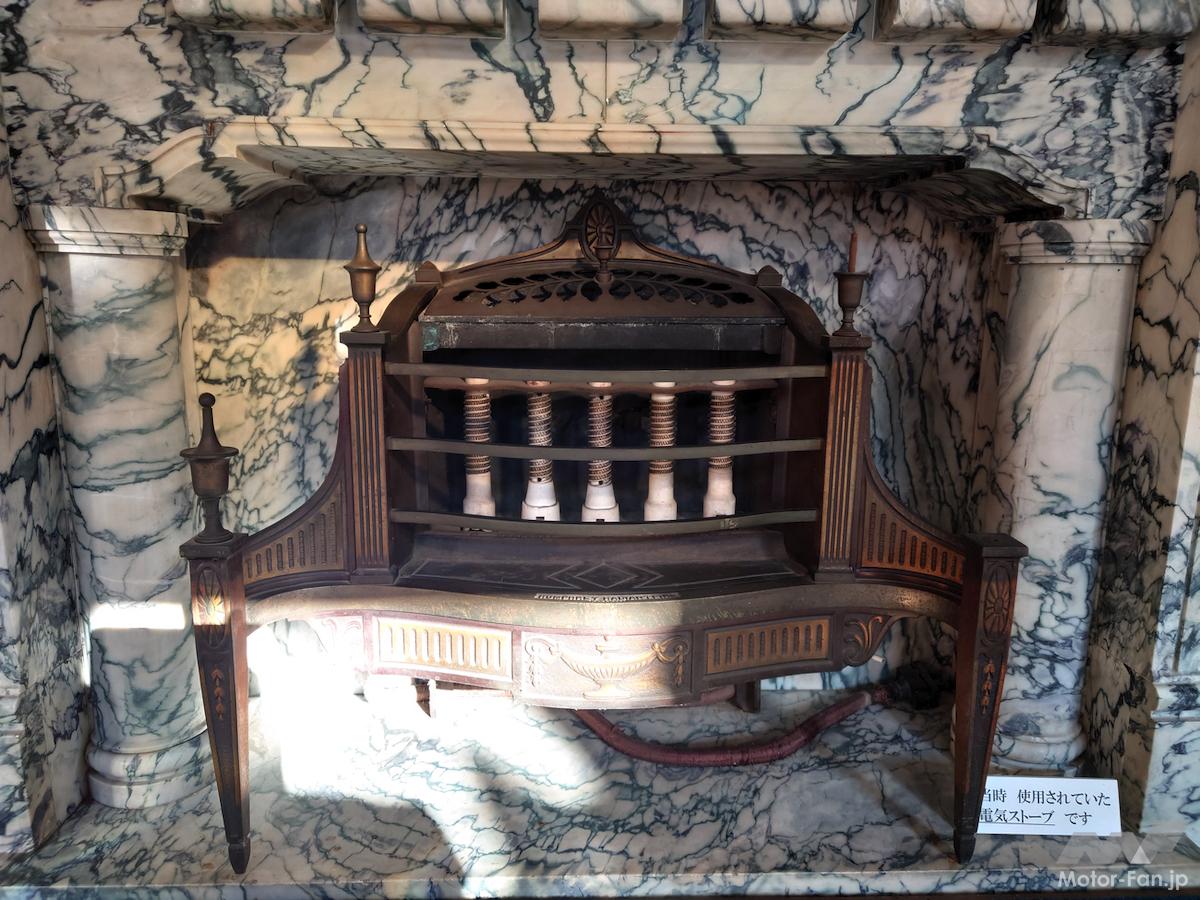 大理石の暖炉は電気ヒーターで、中に水を入れて蒸気を出して加湿する機能も備えています。中島知久平さんは明治17年生まれながら、現代人と変わらない感覚だったことが想像できますね。もちろんシャンデリアも電気で灯されます。柱にはコンセントがあるし、ブレーカーも装備。