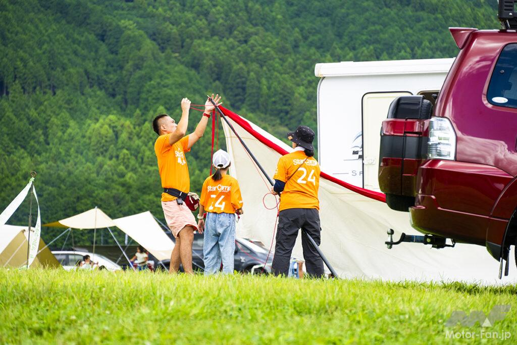 開催日前日には台風15号の影響で豪雨となった会場のふもとっぱらキャンプ場だったが、当日はその影響もなく、快適な状況でスタート。富士山は雲に隠れたままだが、晴れ渡り、青空が広がった。広〜いキャンプサイトには様々な三菱車が集結。デリカD:5やアウトランダー、デリカミニの現行車を筆頭に、パジェロ、ランエボなどマニアックな三菱車が参加。色とりどりのテントやタープが張り巡らされた。様々なイベントが用意されているが、参加してもいいし、しなくてもいい。自由を楽しむこと、それが「スターキャンプ」の真髄なのだ。