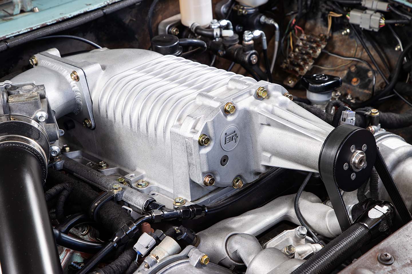 北米仕様のレクサスLSやGSにも搭載されていたため、アメリカにも流通している3UZ-FE型V8エンジン。だが、EGR(排ガス循環装置)がつかない日本仕様にこだわり、わざわざ輸入して換装した。スーパーチャージャーはもともと付いていた“FORD”と“SVT”のロゴを削り落として、“トヨタ”のロゴを貼り付けるこだわりよう。