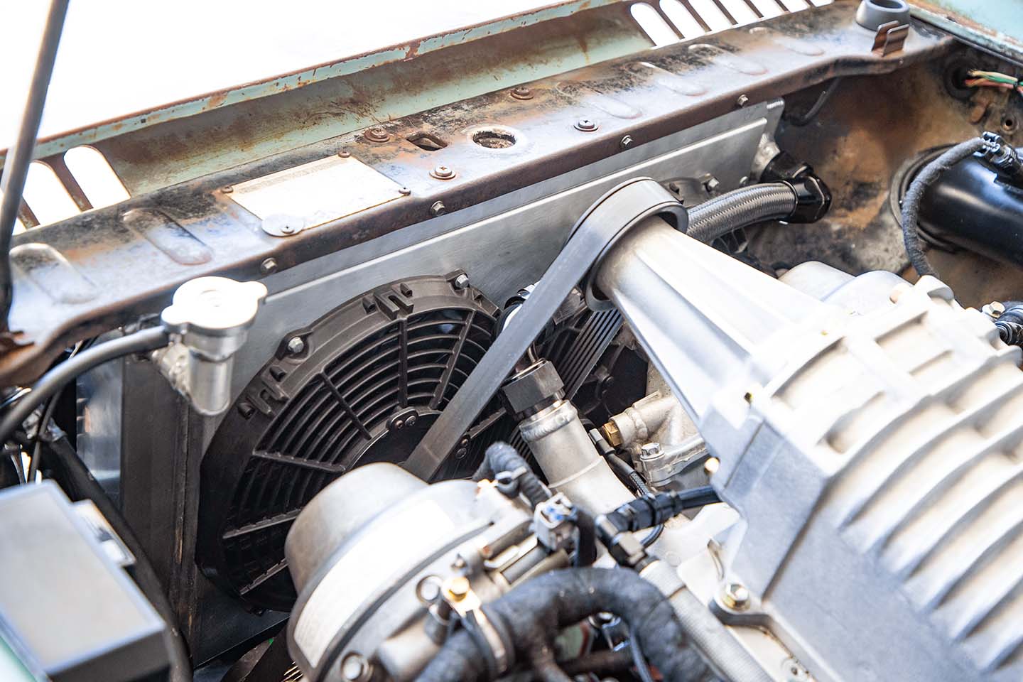 スーチャー本体の下側にニュージーランドのELATE製水冷式マニホールドを装着し、外付けインタークーラーもリヤの下回りにマウント。その近くにはエアサスのエアタンクとVIAIRのコンプレッサーも配置されている。フレームは一切カットせず、アルミラジエターを収めるためにコアサポートの一部を切ったのと、もともとコラムシフトのため、フロアトンネルの一部を切ってCUBEスピードのショートシフターを取り付けてあるのが数少ない切開ポイントだ。