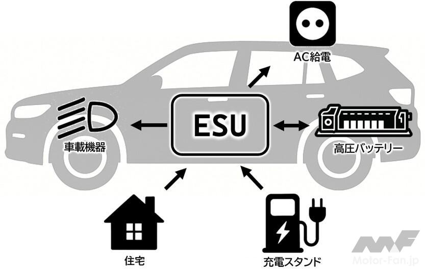 ESUは、普通・急速充電機能と給電機能、DC-DCコンバーター(電圧変換)機能、電力分配機能を統合した、BEVの効率的な電力利用に関わる重要なパワーエレクトロニクス部品で、充電スタンドからの充電、家庭用電化製品への給電、車内の電子機器を動作させるための電力供給などを行う。