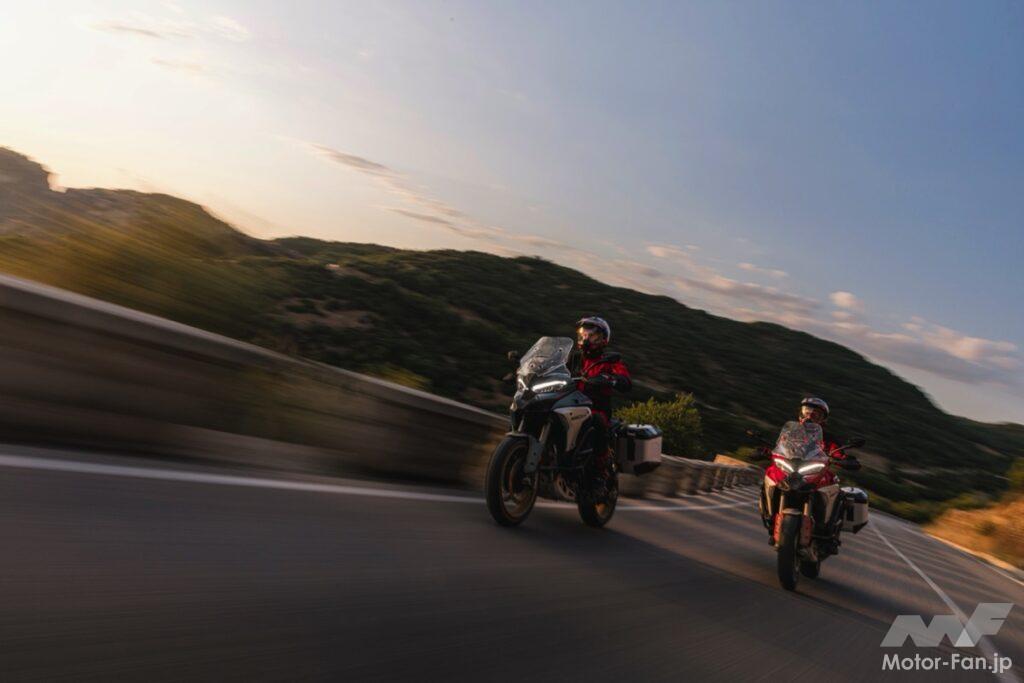 2026年モデル最大の進化は、ドゥカティ・スカイフック・サスペンションEVO(DSS EVO)の新制御アルゴリズムにある。走行中に路面状態や荷重、ライディングスタイルを解析し、瞬時に減衰力を最適化するシステムが導入されたことで、快適性と安定性の両立が一段と進化した。さらに新搭載の「ドゥカティ・ビークル・オブザーバー(DVO)」は、MotoGP由来の制御ロジックを応用。70もの仮想センサー入力を用いて車体挙動を高精度に推定し、ABSやウィリーコントロールの作動を最適化する。