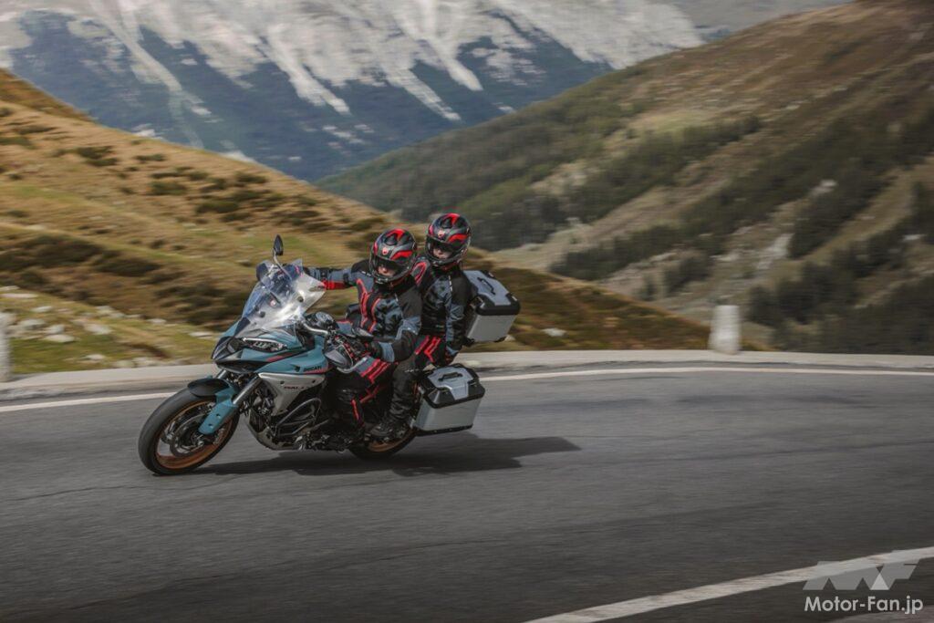 V4グランツーリスモエンジンは1,158cc、最高出力170hp、最大トルク121Nmを発揮。リアシリンダー休止機構を備え、燃費と快適性の両立を実現。新開発のDQS 2.0クイックシフターにより、より短いストロークとダイレクトな操作感を提供する。アルミモノコックフレームと軽量スポークホイールにより、重量バランスと耐久性を両立。サスペンションのアンチスクワット効果を高めた新設計スイングアームと、大径280mmリアディスクが制動性能を支える。