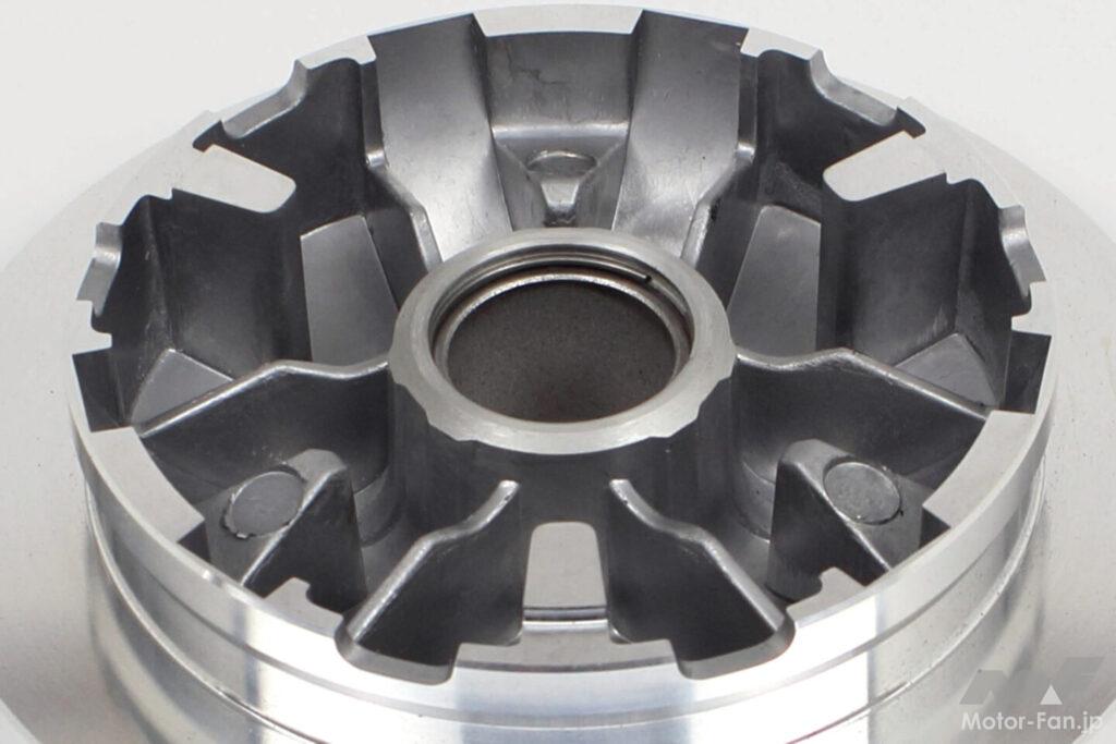このパーツ群を上記車種の純正プーリーと交換することで、加速性能の向上と最高速アップを実現! 純正プーリーよりもプーリー径を大径化するだけでなく、繰り返し行ったテスト開発により得たデータを元に、オリジナル形状のローラーガイド、ランププレート、スライドピースを採用。その結果、低速からの安定した出力の発揮&最高速を向上。