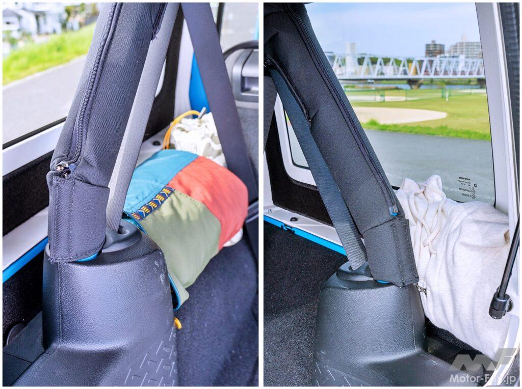 ここには小さなグッズならばいくつか積むことができるが、ウインドウのすぐ近くなので、重い物や金属製のグッズは怖くて置けない。そこで筆者は、ウインドウ保護を兼ねてアウターなどの衣類、マット、ブランケットなど柔らかいものを挿し込むスペースとして利用している。