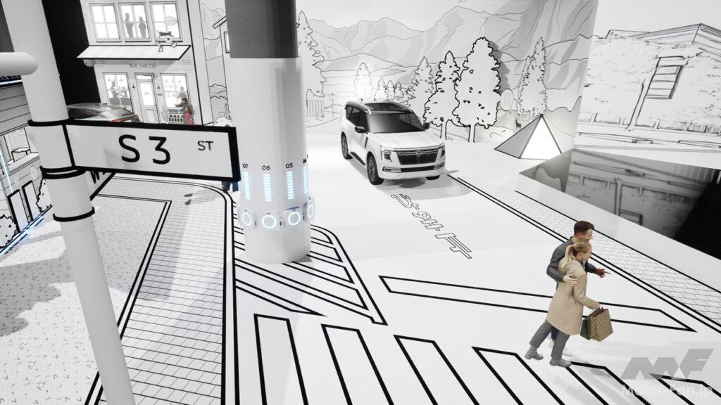 遊び心に洗練性を加えたデザインは、来場者を活気ある都市のような空間へと誘い、日産のモビリティの未来を肌で感じられる