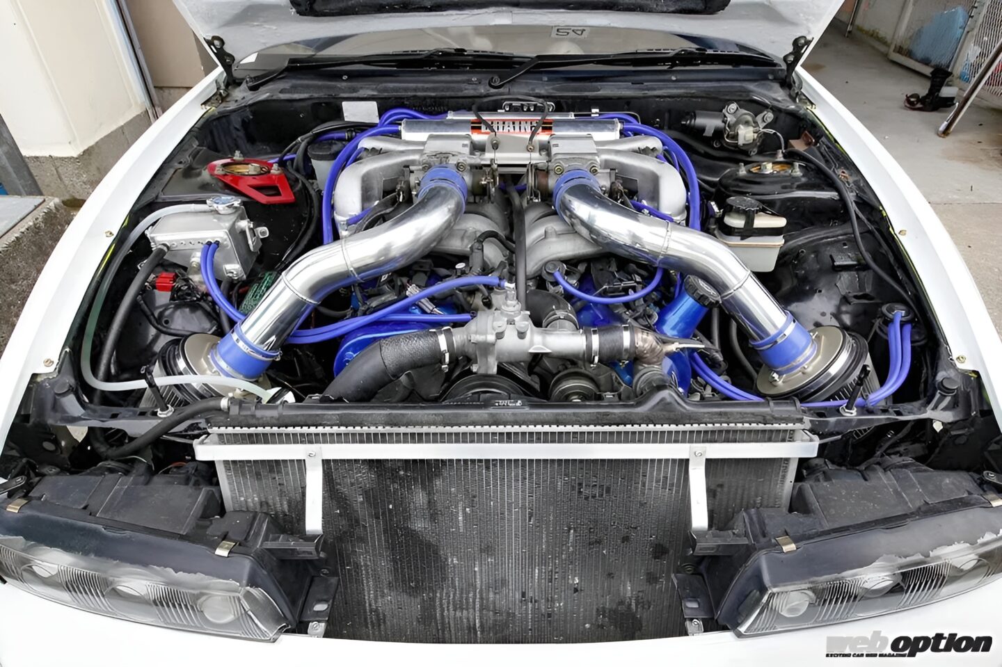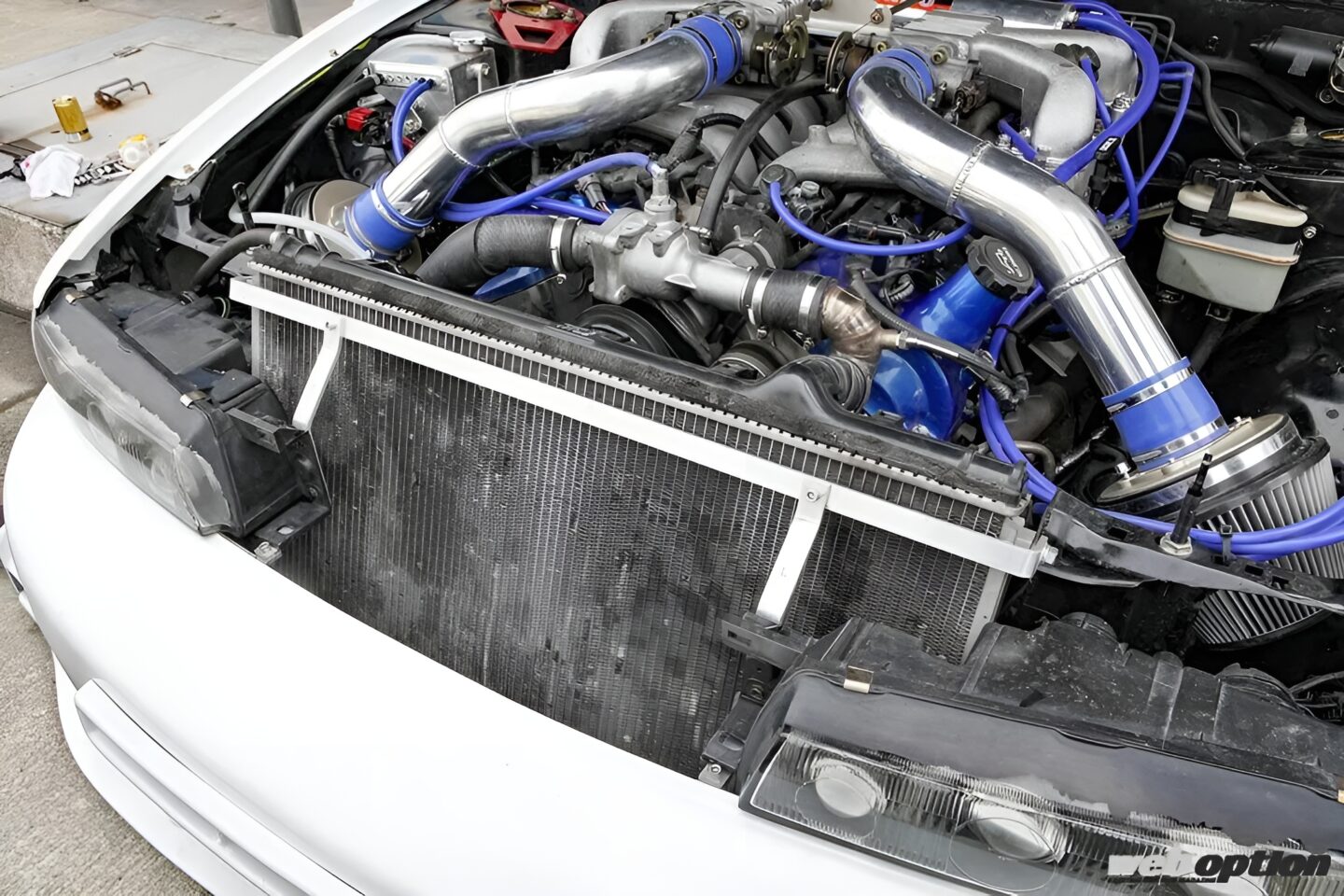 もちろん、4気筒エンジンとは寸法が全く異なる1GZを換装する作業は難航を極めた。バルクヘッドやコアサポートの干渉箇所はカットし、邪魔になるパワステポンプは電動のMR2用に変更してトランクに移設。さらにオイルパンと干渉するスタビは他車種用に変更して対策するなど、メイク&エラーを繰り返しながらS13シルビアのV12化を実現したのだ。