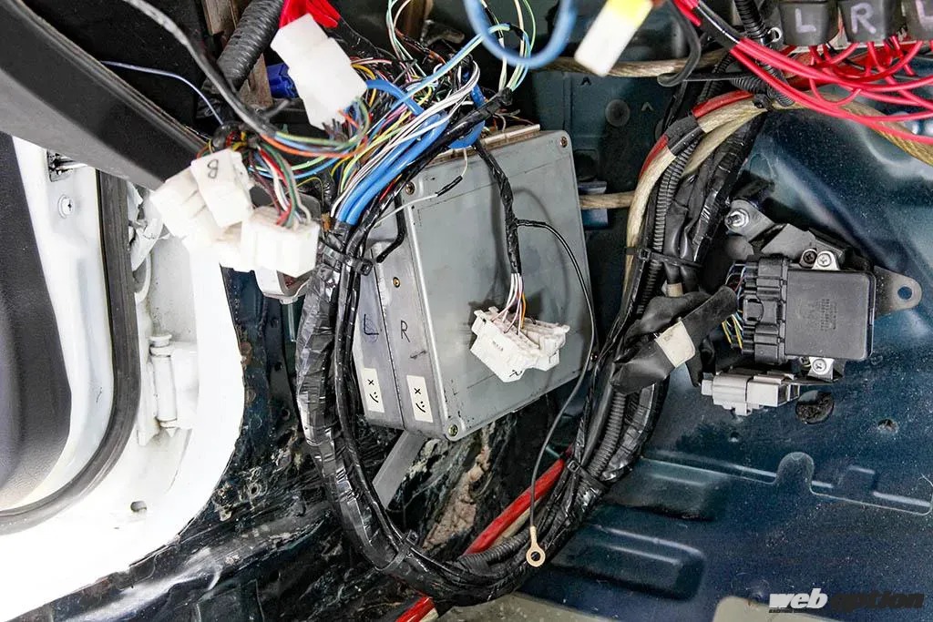 某トヨタ6気筒エンジン用のECUを2基掛けし、必要な信号のみを拾ってエンジンコントロール。コンピュータの書き換えは行わず、リレー&配線加工のみで制御している。