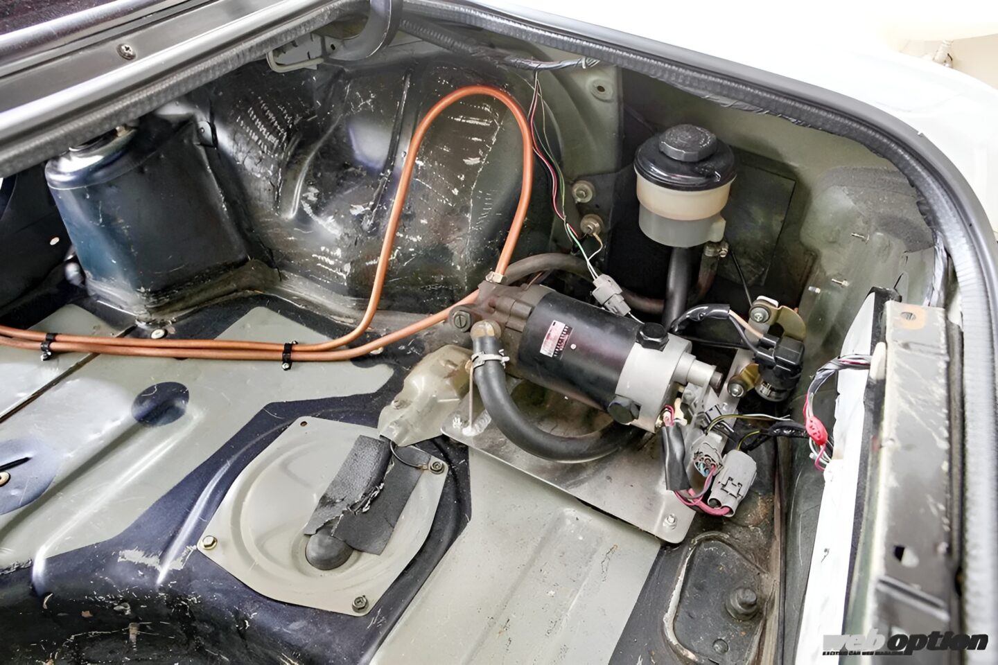 トランクルームには、行き場所を失ったSW20純正の電動パワステポンプが設置されている。