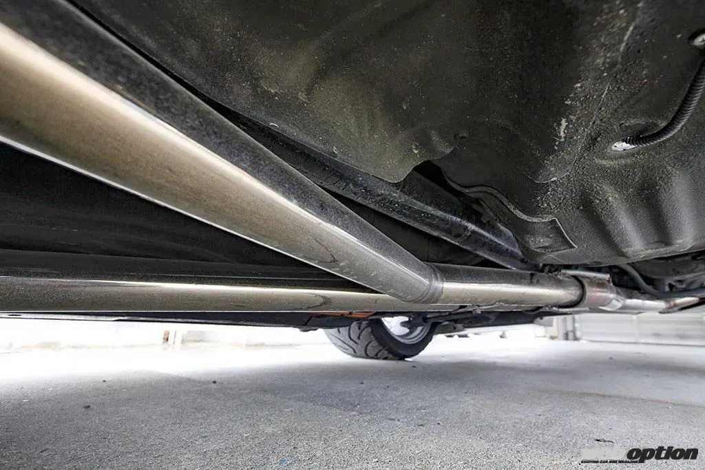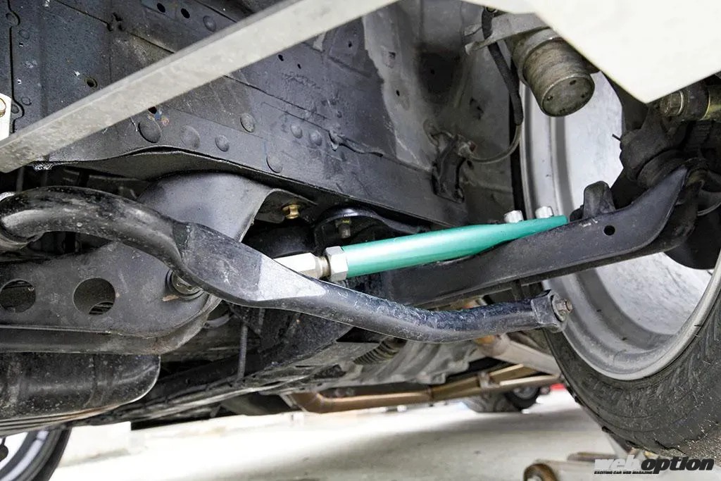 オイルパンが純正スタビと干渉してしまうため、ちょうど良さそうな形状だったY33用を流用。テンションロッドブラケットにマウント部を、ロアアームにスタビリンクをそれぞれ設けてマウントしていた。