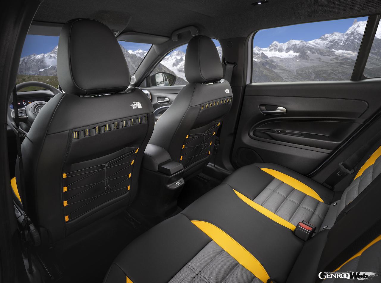 シートは丈夫で洗濯可能な素材がチョイスされ、サミットゴールドの縁取りがアクセントとして追加された。また、ノースフェイスのダウンジャケットを思わせる専用デザインディテールも採用。シートバックにはノースフェイスのバックパック・ストラップをイメージし、伸縮性のあるストラップが取り付けられている。