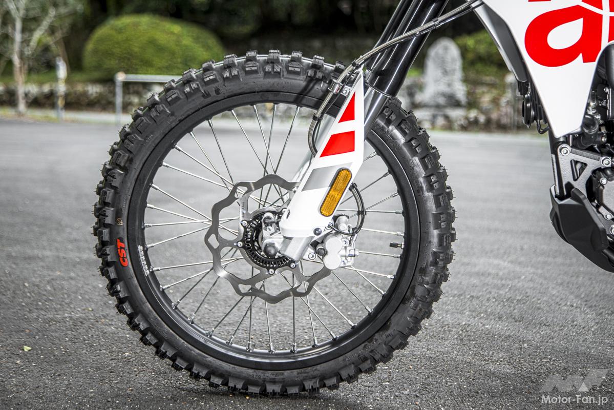 アプリリアRX125は原付二種でありながら250ccフルサイズオフローダー並の車格と質感を誇るマシンである。細かな部分までしっかり作り込まれていて、上級レベルのバイクと比べても全く遜色がない。フレームはツインチューブタイプで倒立フォークを採用。タイヤはフロント21インチ、リア18インチのフルサイズだ