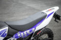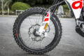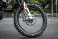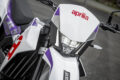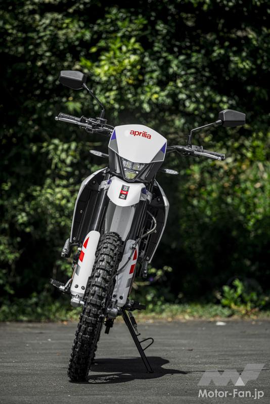 アプリリアRX125は原付二種でありながら250ccフルサイズオフローダー並の車格と質感を誇るマシンである。細かな部分までしっかり作り込まれていて、上級レベルのバイクと比べても全く遜色がない。フレームはツインチューブタイプで倒立フォークを採用。タイヤはフロント21インチ、リア18インチのフルサイズだ