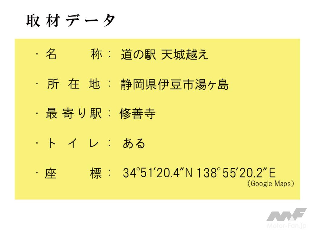 今回の下記住所と座標データは、「道の駅 天城越え」です。修善寺からはだいたい17kmぐらいの距離。タイトル写真にある石造りの「天城隧道(1905年開通の旧天城トンネル)」までは残す所あと5kmの位置。逆に約2.5km手前(修善寺寄り)には浄蓮の滝観光センターがあり、ここも駐車場やトイレ、オアシスとしての設備が揃っています。また道の駅 天城越えの先1kmほど(下田寄り)には「滑沢渓谷」があり、バイクを置いて散策し清流の癒しを満喫できます。予め下記観光情報サイトで周辺状況を調査しておくのがお勧めです。