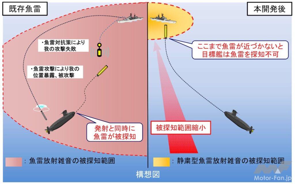 魚雷から発生する雑音を抑えることで、敵に発見される危険性が減り、相手に反撃や対抗手段の余裕を与えない。また、潜水艦自身も攻撃を受ける可能性が大きく減るだろう(画像/事業評価報告書より)