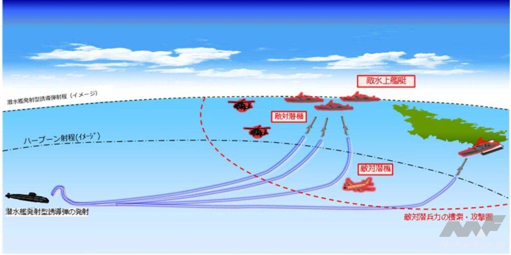 魚雷だけでなく、今後は長射程の巡航ミサイルも装備される予定だ。これまでも、アメリカ製の対艦巡航ミサイル「ハープーン Block2」を搭載できたが、新たに国産の「潜水艦発射型誘導弾」の量産がスタートする。公表されている運用構想図によれば、このミサイルはハープーンを上回る射程を持ち、敵の探知・攻撃圏外から敵艦船を攻撃することを目指している。