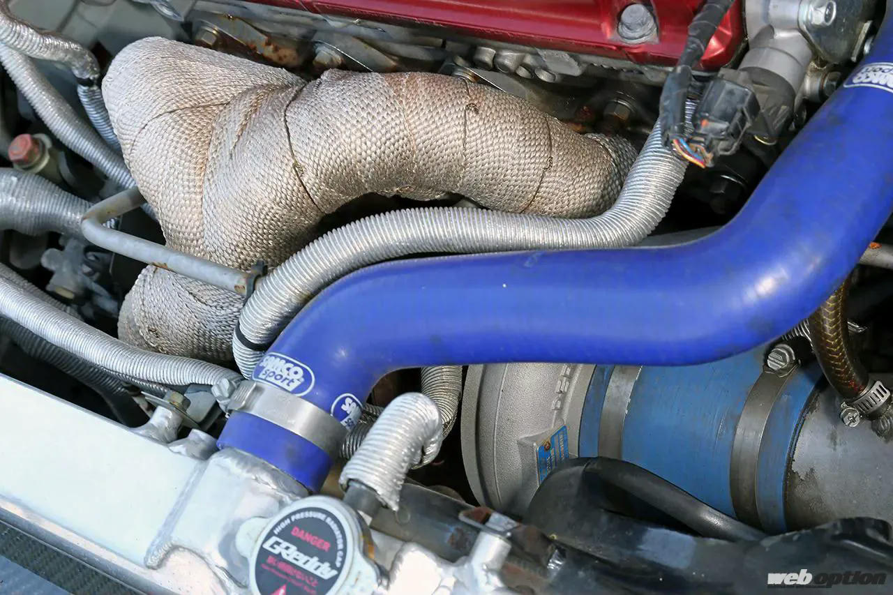排気系はEXマニとフロントパイプがタービンキット付属のトラスト製で、エンドマフラーはフジツボのチタンタイプを投入。駆動系では、RSメンバーの移植でリヤデフをAYCから機械式に変更している点に注目だ。