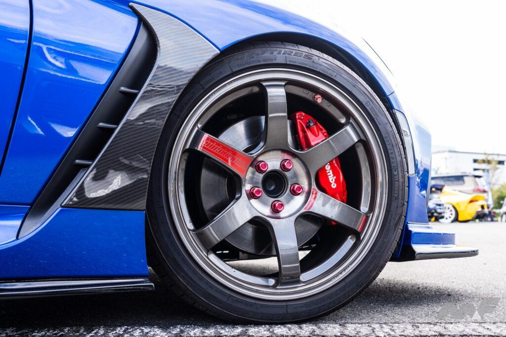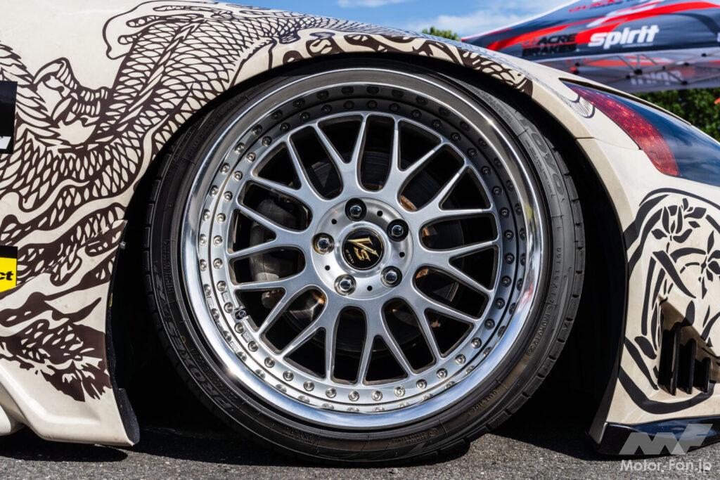 まず、プロクセスTR1を履く三菱・エクリプス。鮮やかなグリーンのボディは言うまでもなく映画「ワイルド・スピード」の劇中車を再現したもの。ただでさえ絶滅危惧車種の希少な2代目エクリプスの外観は、今回出展もしているART FACTRY GRAPHICSが手掛けたもの。つまり、オフィシャルに認められた公認ワイスピ車両の一台というわけだ。