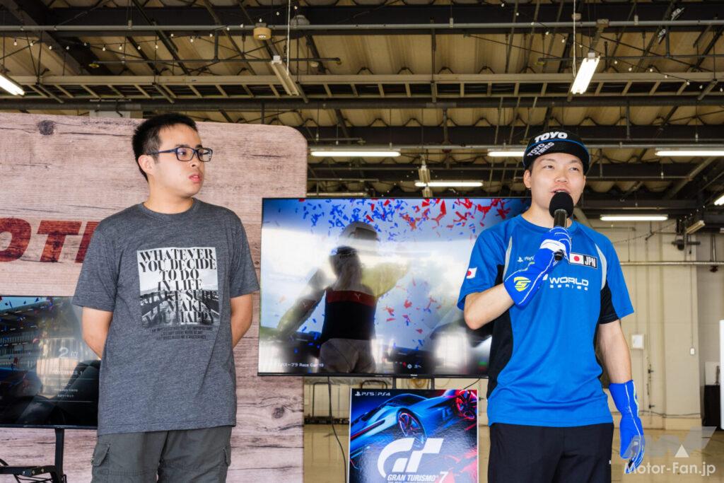 場内ではその他に、TOYO TIRESの社員でありグランツーリスモの世界チャンピオンである宮園拓真選手とのグランツーリスモ対決が行われ、一般参加ユーザーが見事世界チャンピオンに勝利していた。