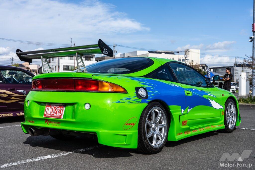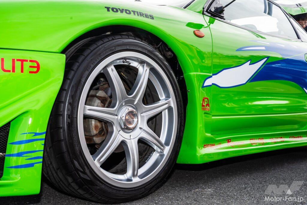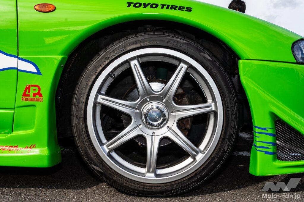 まず、プロクセスTR1を履く三菱・エクリプス。鮮やかなグリーンのボディは言うまでもなく映画「ワイルド・スピード」の劇中車を再現したもの。ただでさえ絶滅危惧車種の希少な2代目エクリプスの外観は、今回出展もしているART FACTRY GRAPHICSが手掛けたもの。つまり、オフィシャルに認められた公認ワイスピ車両の一台というわけだ。