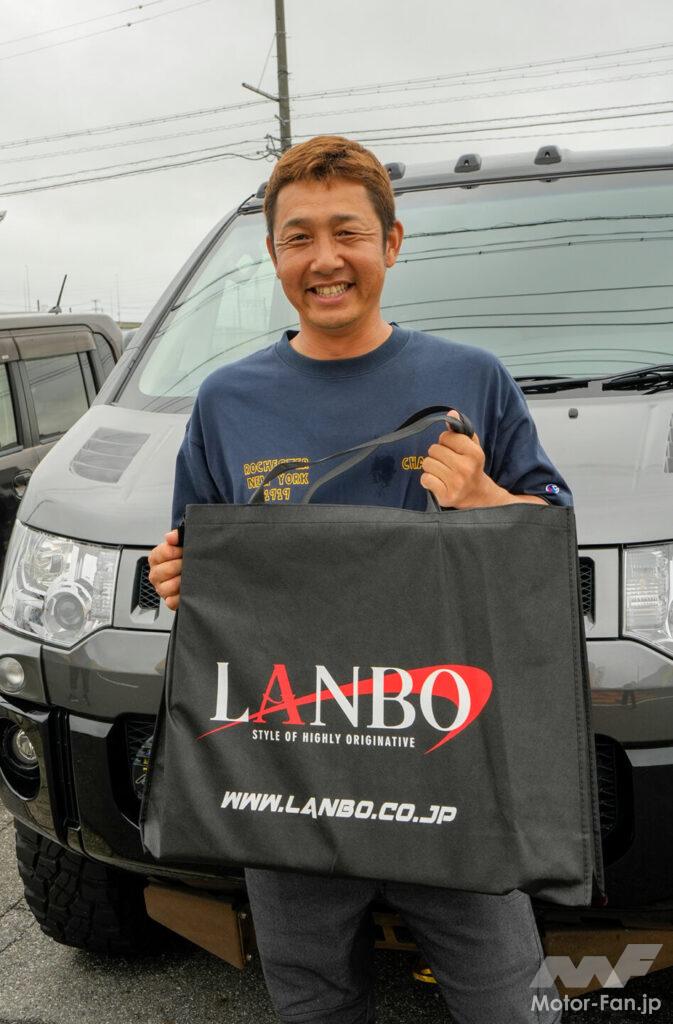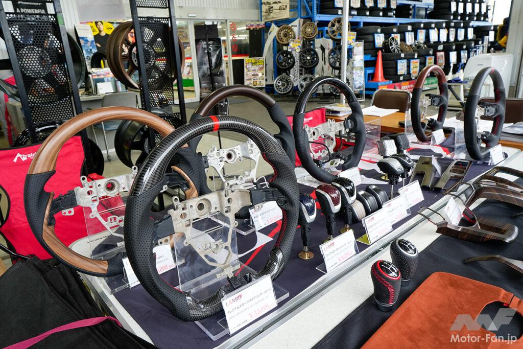 ノーマルから8年かけて完成度の高い姿に仕上げたチャンデリさんのデリカD:5。ジャオスのサスペンションキットと4インチブロックを組み合わせた足元はインパクト満点。またチャンデリさんがアンバサダーをしている「HID屋」アイテムによるライティングチューンで、さらなるオリジナリティもプラス。すでに生産終了になったエルフォードのランプ内蔵ボンネットと合わせてインパクト抜群だ。この日はテカテカになってしまい気になっていたステアリングをランボ(ブラックベアー)にてイベント特価でゲット。商品はお持ち帰りをして自分で取り付けする。