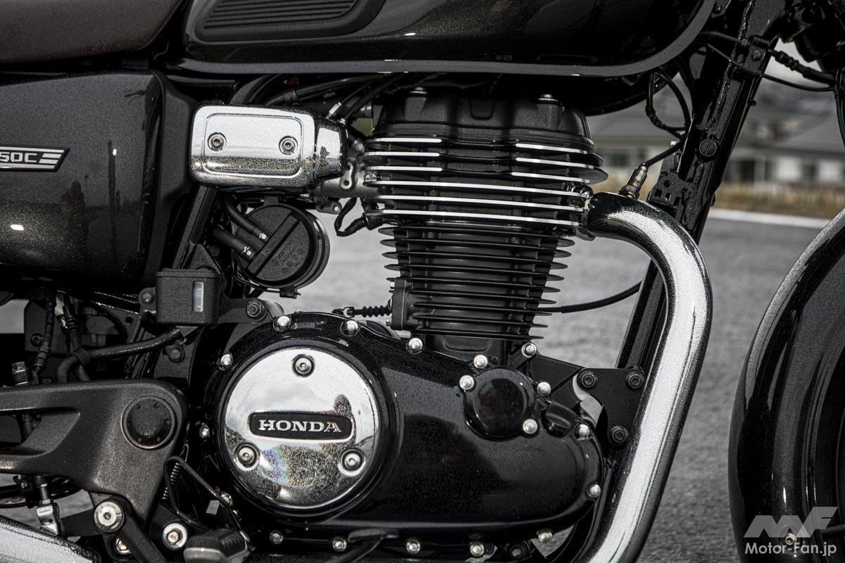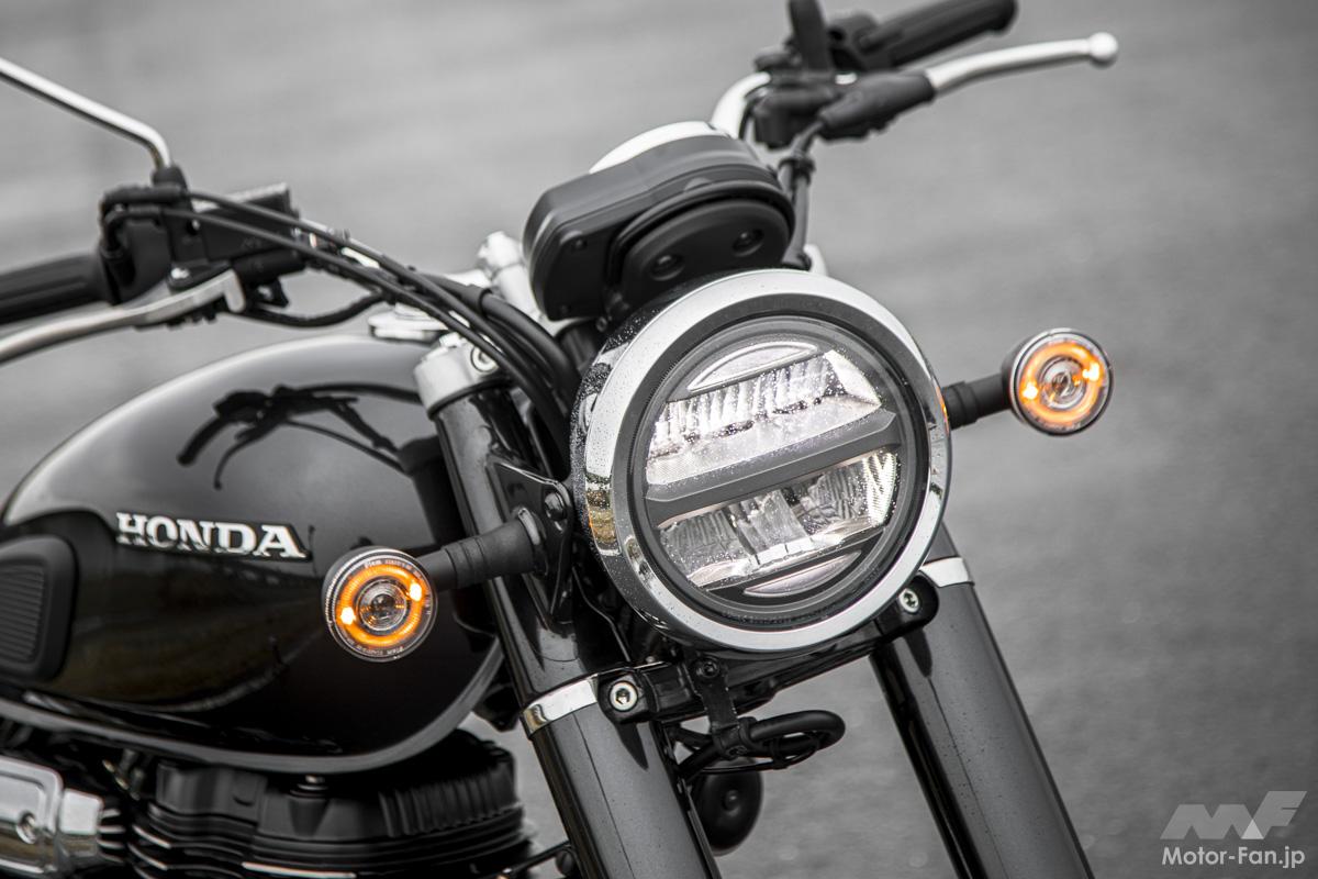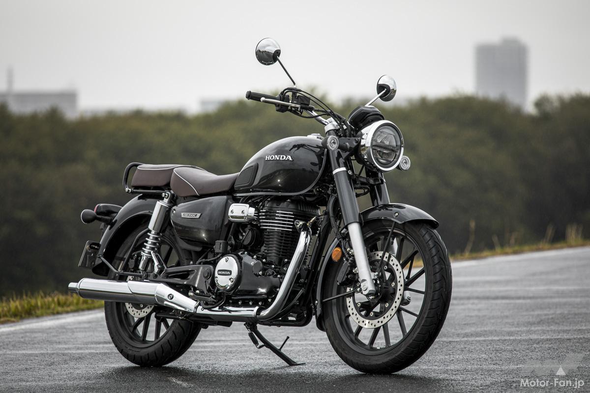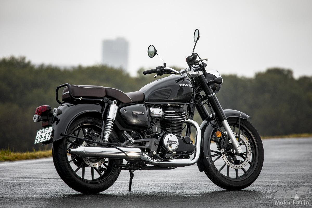 フロントフォークカバーやヘッドライトカバー、セパレートタイプのシート、水平基調のマフラーを採用したことで大きくイメージを変えている。タンクからシート、リアへ続くなだらかなラインが描かれたスタイルは美しい。重量はGB350から7kg増えた186kgになっている。