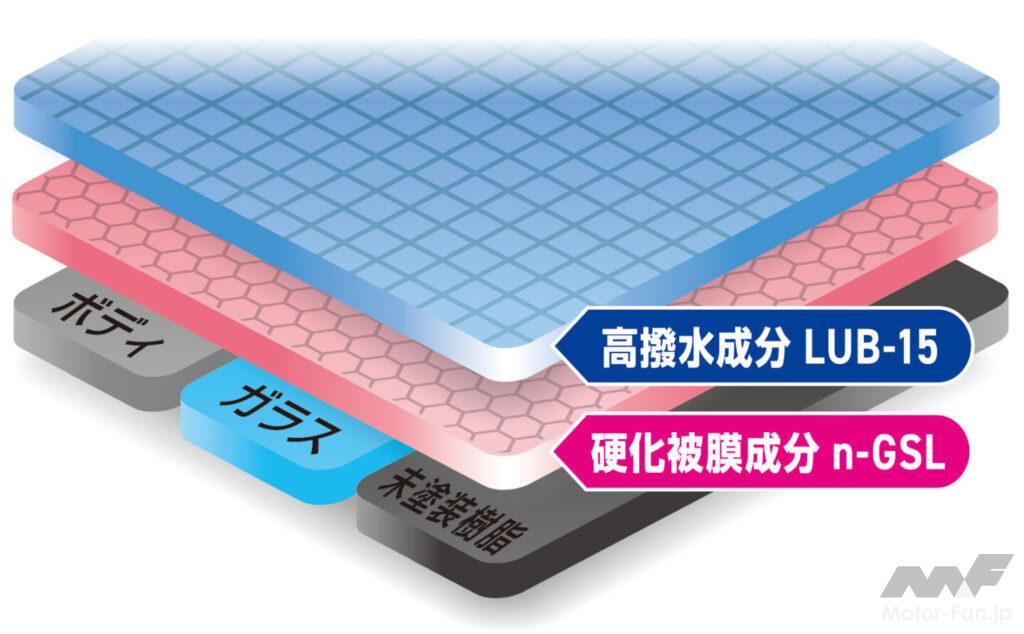そのメカニズムは、新たに開発された技術「 R.M.C-Gen3.2」と呼ばれる湿気硬化技術。プロが使用する業務用コーティング剤の技術を応用しつつ、さらに発展させているのだ。この技術は空気中の湿気と反応することで溶剤が揮発しはじめ、溶剤の中にランダムに配合される高撥水成分「LUB-15」と硬化被膜成分「n-GSL」がそれぞれの層を形成しはじめるというもの。ボディはもちろん、ガラスや未塗装樹脂に至るまで、均一で強固な被膜を形成するのだ。まさにプロ用コーティング剤の技術を取り入れた、史上最強のスペックを備えているというわけである。