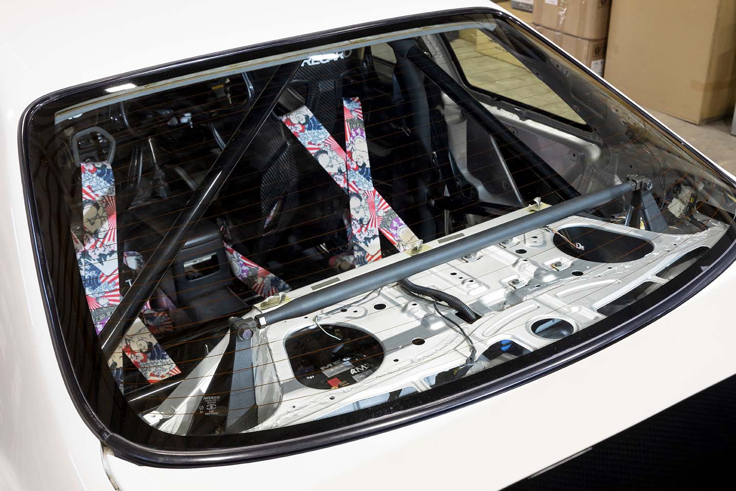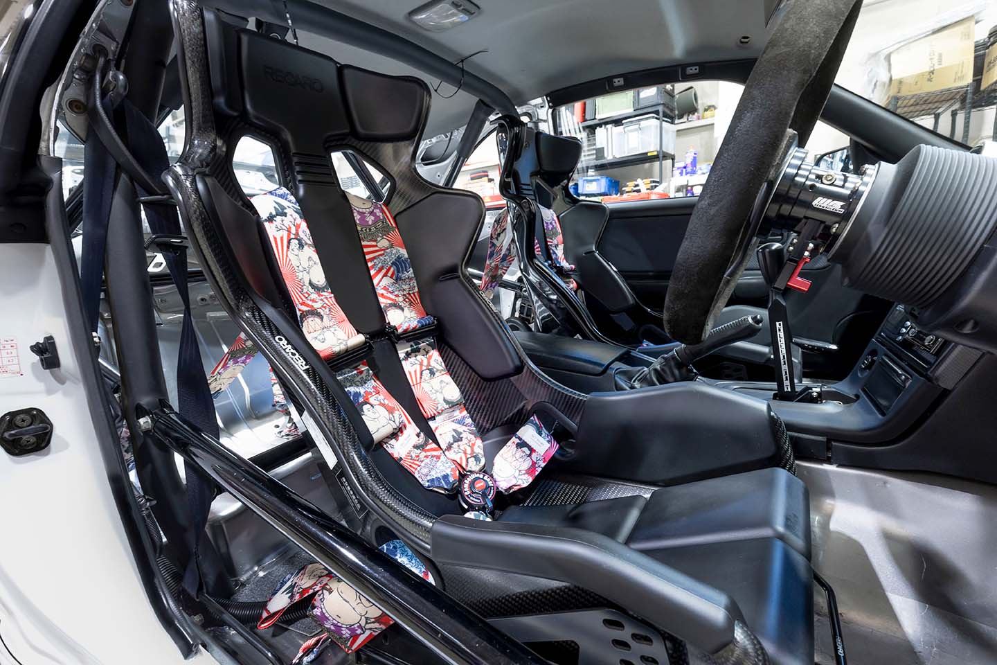 レカロRMSとHPIの和柄シートハーネスの組み合わせが、グローバルな雰囲気を醸し出す。ホワイトボディ状態でのフルスポット増しに加え、11点式ロールケージにより大幅な剛性アップも図られている。