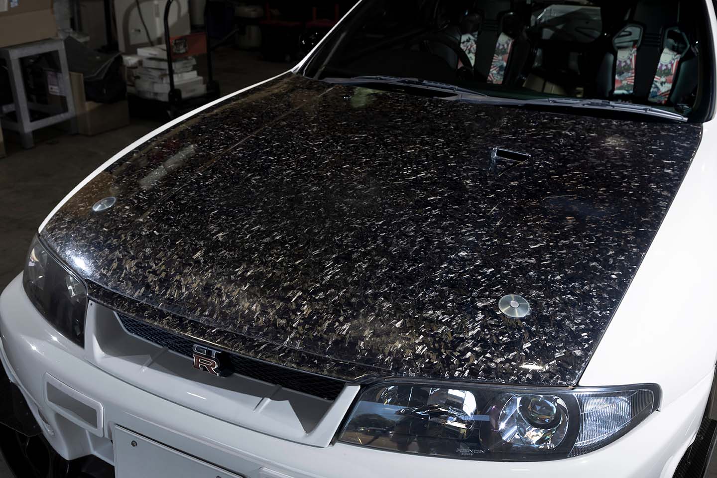 クラッシュドカーボン製のワンオフボンネットは、見た目の迫力と軽量化を両立。灯火類はあえて純正に戻し、全体のトーンをオリジナルに寄せているのもこだわりの一環だ。