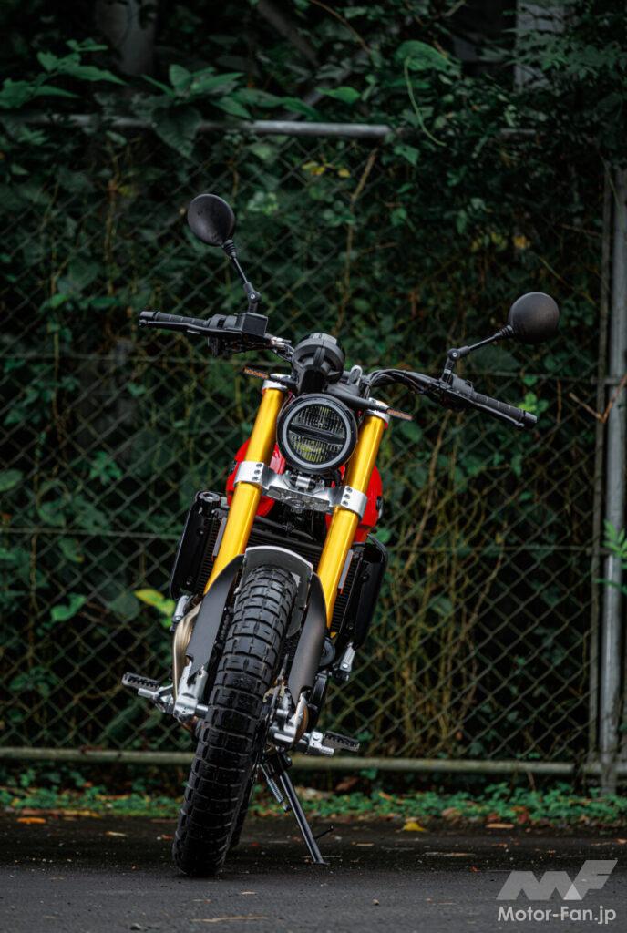 それを支えるのが、これまたNEWとなっている車体。簡単に言えばネック角を少し寝かせた、ということなのだが、加えてフォークのダンピングが見直されたためフロント回りに落ち着きがでた。先代モデルもこの方向に振ってあり、初期型のピョコタンとしたダンピングは改善されていたが、最新型ではさらにここに手を入れ別物のようにシットリ仕上げている。これによりオンロードも路面状況に左右されずにより積極的に走れるし、オフロードもかつてはちょっとフロント回りがクイックすぎて攻めきれないところがあったのが改善。真のスクランブラーとして、場面を選ばずにガンガン走れるようになったのだ。