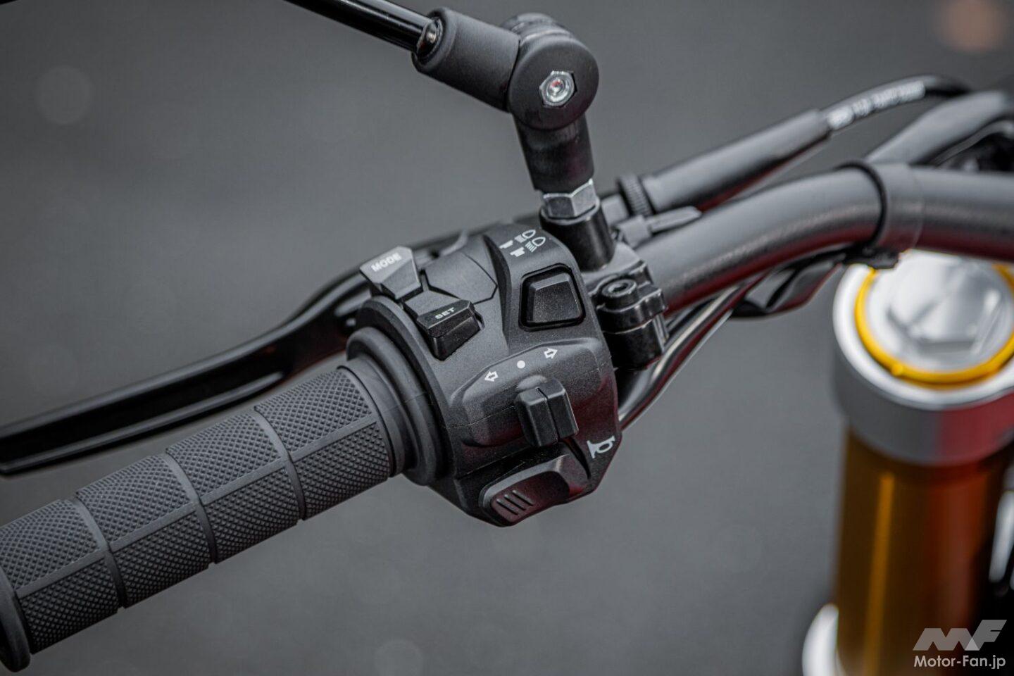 新型は量産品らしい、使いやすい配置で、押した時の反応もわかりやすいものにアップデート。右側には上にハザードスイッチ、下はABSをカットするオフロードモードへと切り替えるボタンであり、長押しして使う。